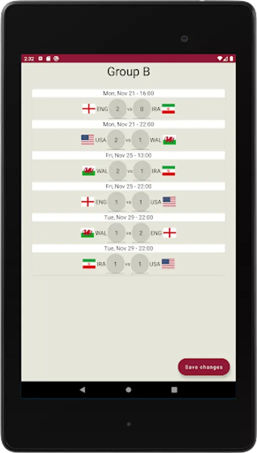 The main screen includes a list of groups that can be clicked to open and see its corresponding fixture. The knock-out graph is a flexible tool to see the potential finalists.