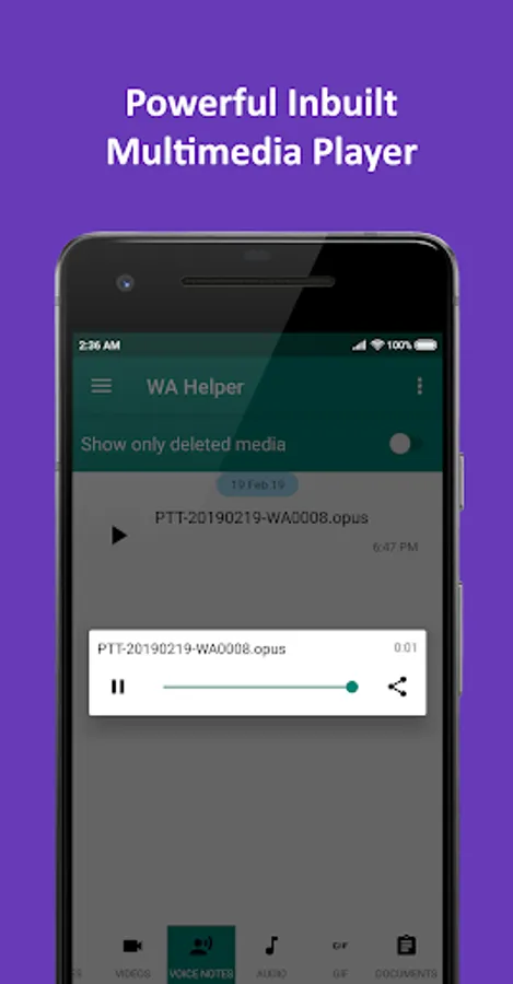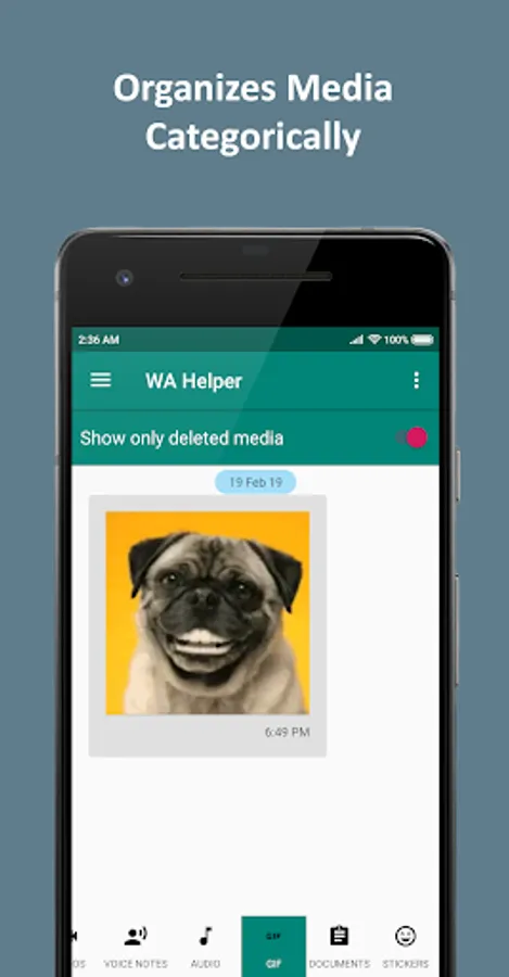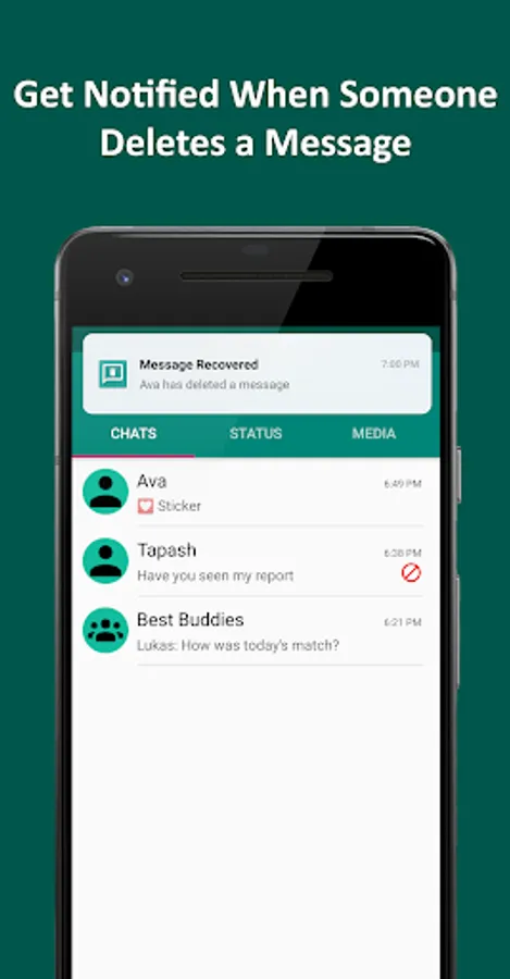 Whenever someone sends you a message and it appears in the notification panel, WA Helper will try to make a backup of it on your device and whenever the sender deletes it WA Helper will notify you immediately. In addition to this WA Helper will also check your storage to see whether any file was deleted, if so WA Helper will notify you immediately.