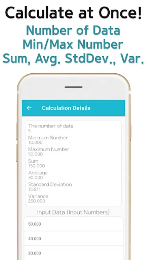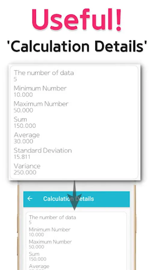 Furthermore, this smart application provides minimum/maximum number, sum, variance calculation results in “Calculation Details” menu.