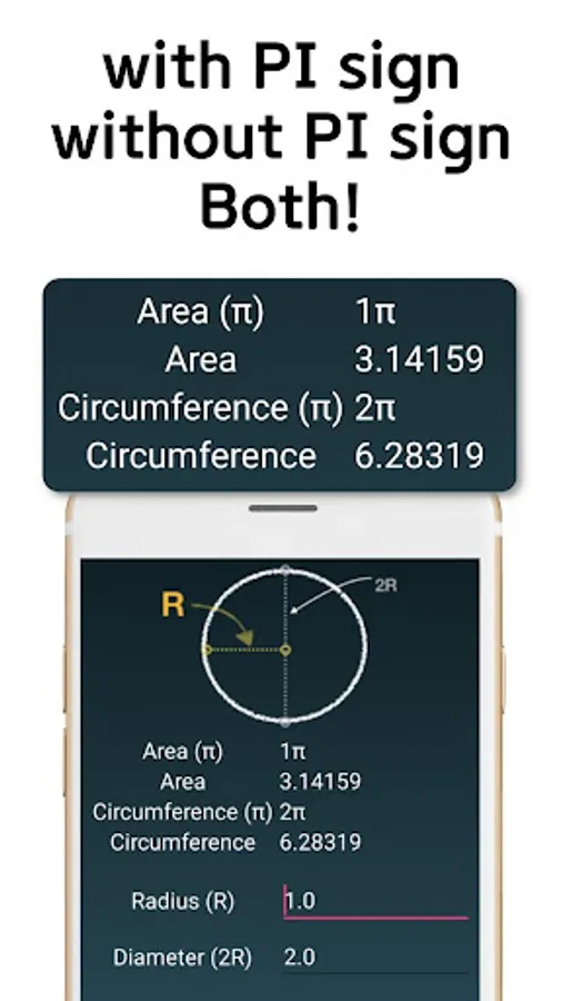 Unlike other apps, Circle Calc provides circle area and circumference values with PI sign and PI number at once.