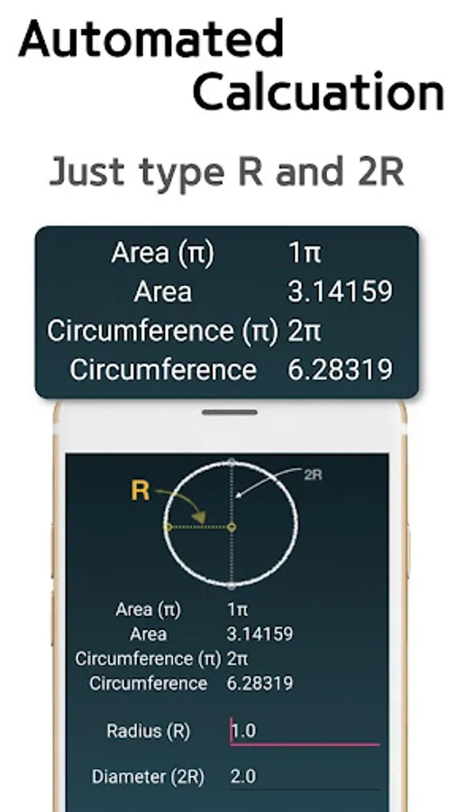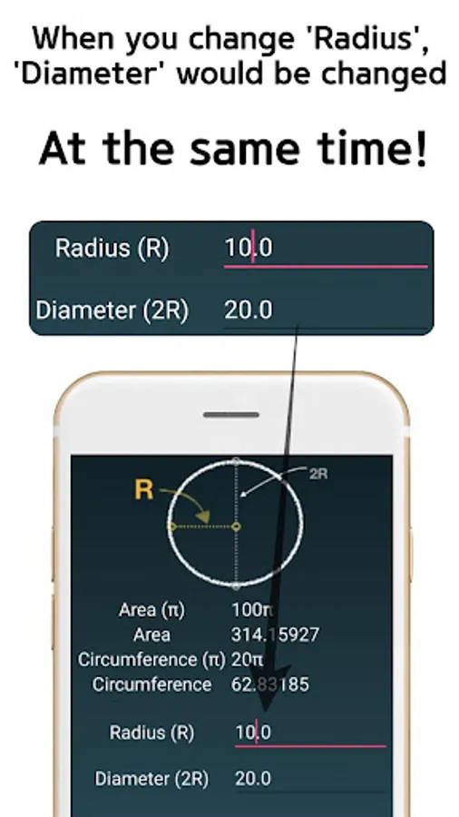 Once you enter a prefered number on a radius section or a diameter section, this app automatically calculates both circle area and circle circumference at once.