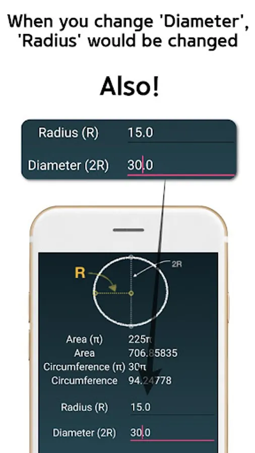 Furthermore, you just need to selectively enter a number between a radius section and a diameter section, since a remained number would be calculated automatically by this app.