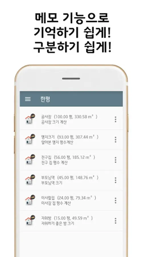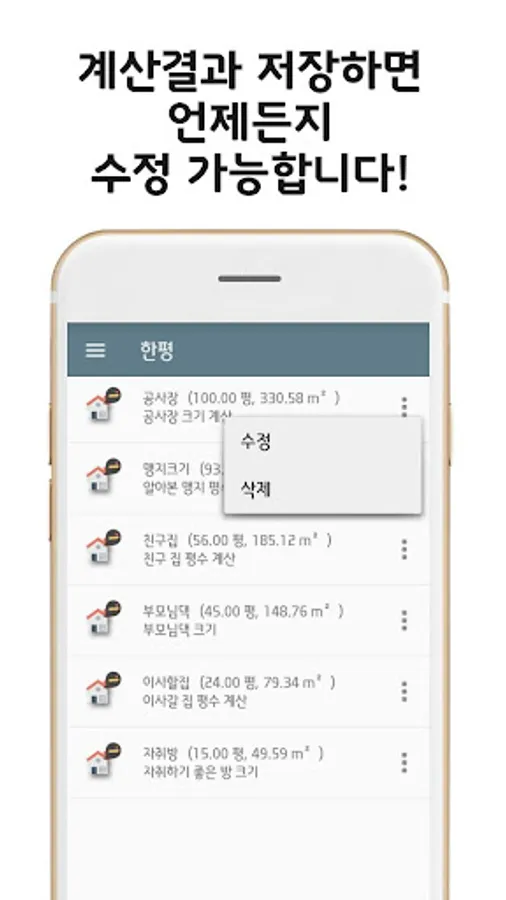 그리고 한평에서는 사용자가 직접 계산한 결과를 메모와 함께 저장하고 불러올 수 있는 기능을 제공하고 있어 면적계산 결과를 빠르고 쉽게 찾아서 사용할 수 있는 기능을 제공합니다.