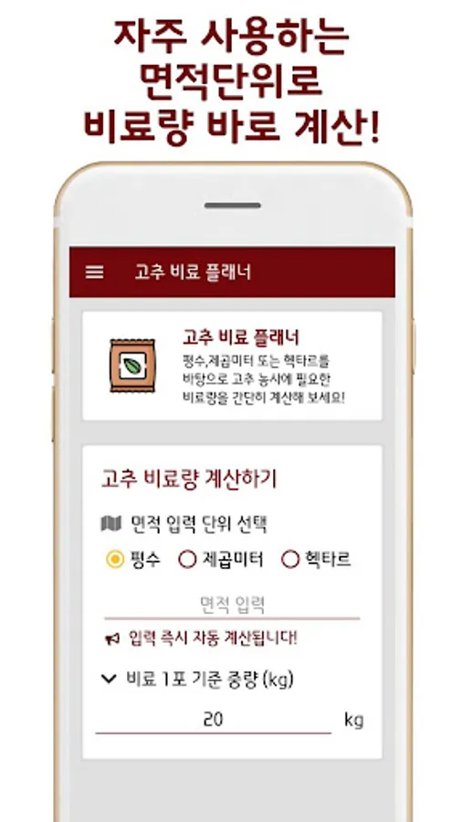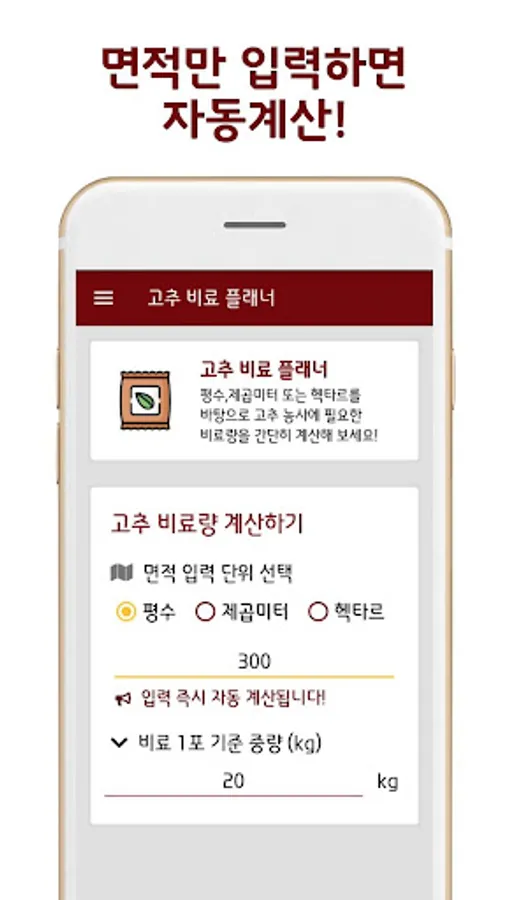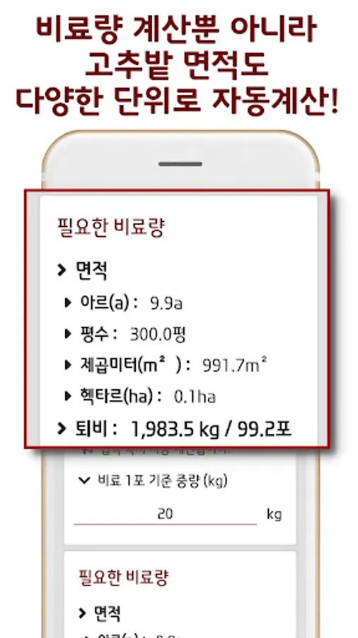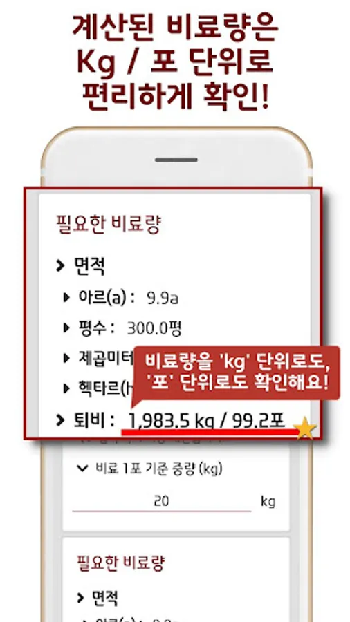 - 킬로그램 (kg) 단위 및 포 단위 필요한 비료량 계산 결과 제공