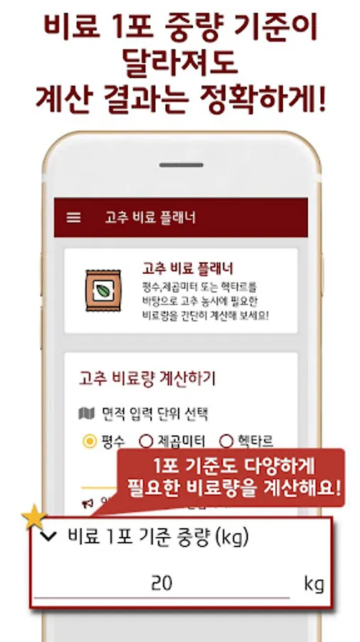 더욱이, 본 계산기에서는 고추농사에 필요한 비료량 계산 결과를 킬로그램 (kg) 단위로 제공하는 것은 물론이고 포 단위로 제공하고 있어 비료구입 계획을 세울 때 편리합니다.