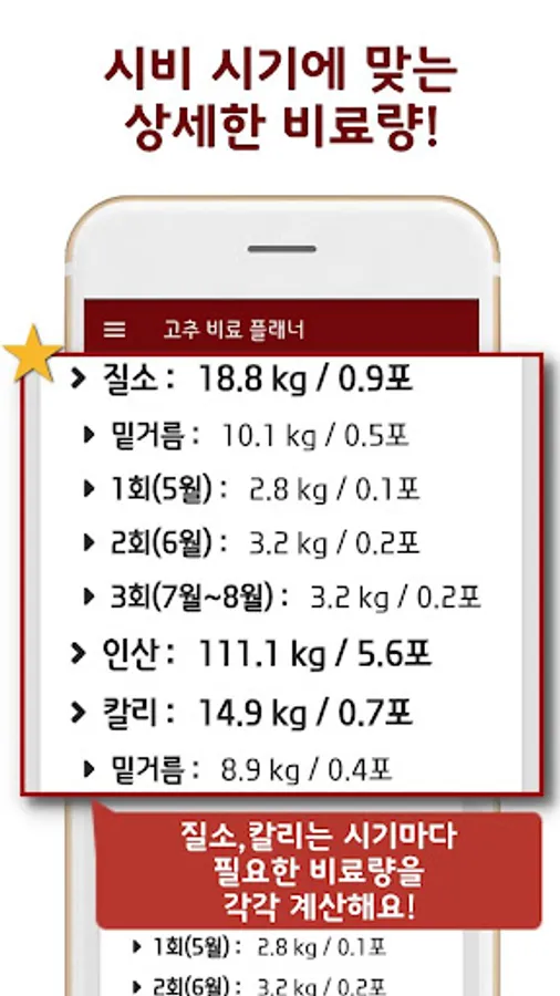 - 고추비료 필요 시기별 세분화된 비료량 계산 결과 제공
