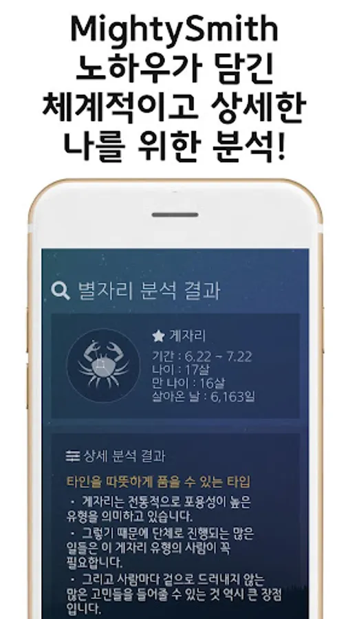 마이티스미스(MightySmith)의 “별자리 성격 분석”에서는 간단히 생일만 입력하시면 태어난 날의 별자리는 물론이고 특징과 앞으로 노력해야 할 점 그리고 보완해야할 점들까지 세밀하게 제공하고 있습니다.