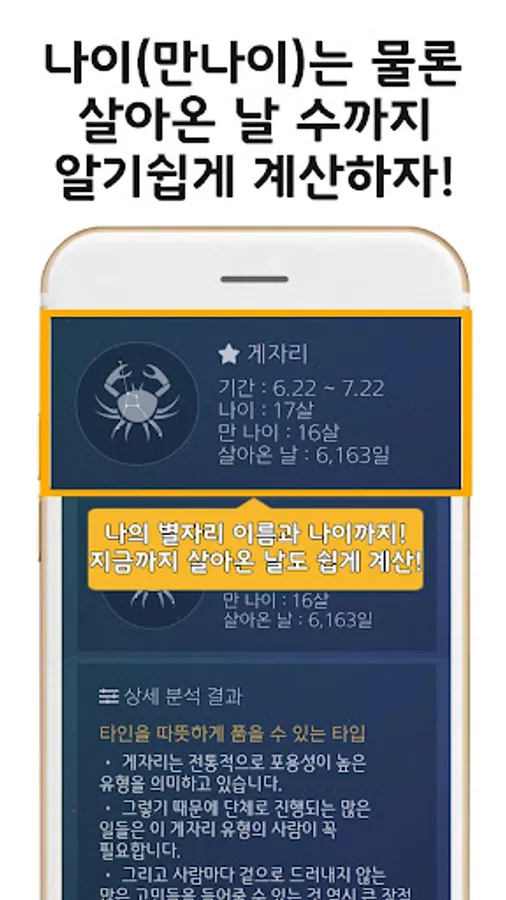물론, 본 별자리앱은 다른 별자리어플과 다르게 자신의 나이 계산 결과 및 만나이 계산 결과와 지금까지 살아온 날 수 계산 결과도 함께 제공합니다.