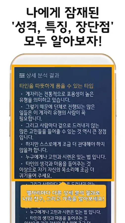 별자리 성격분석 앱은 생일(생년월일)을 기반으로 자신이 태어난 날에 해당하는 별자리를 통해 같은 별자리에 속한 사람들이 가진 공통적인 잠재된 능력과 공통점, 장점, 단점, 성격 및 특징 등을 분석하고 그 결과를 총정리해서 제공하고 있습니다.