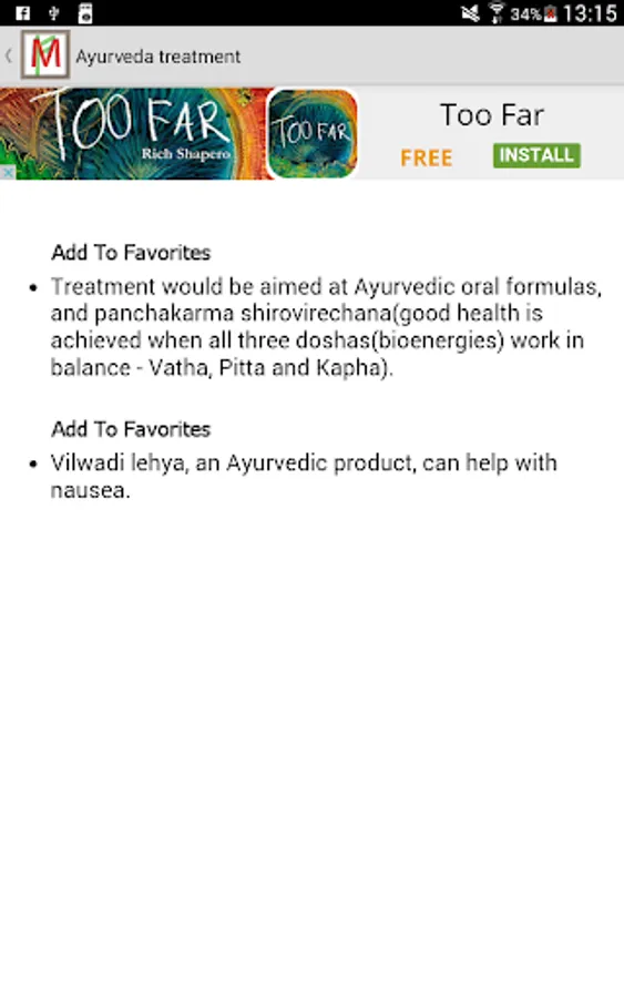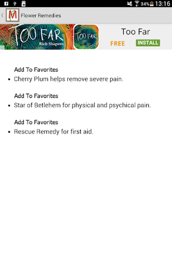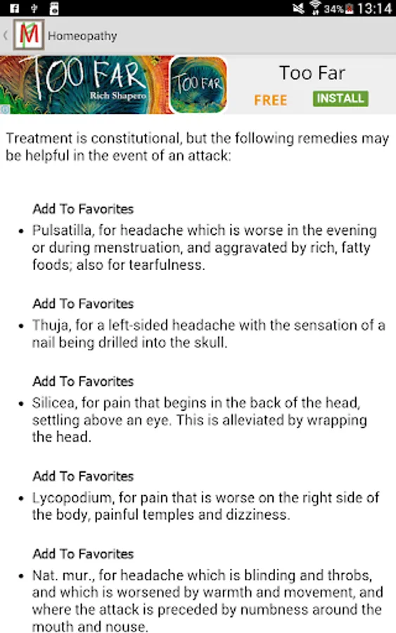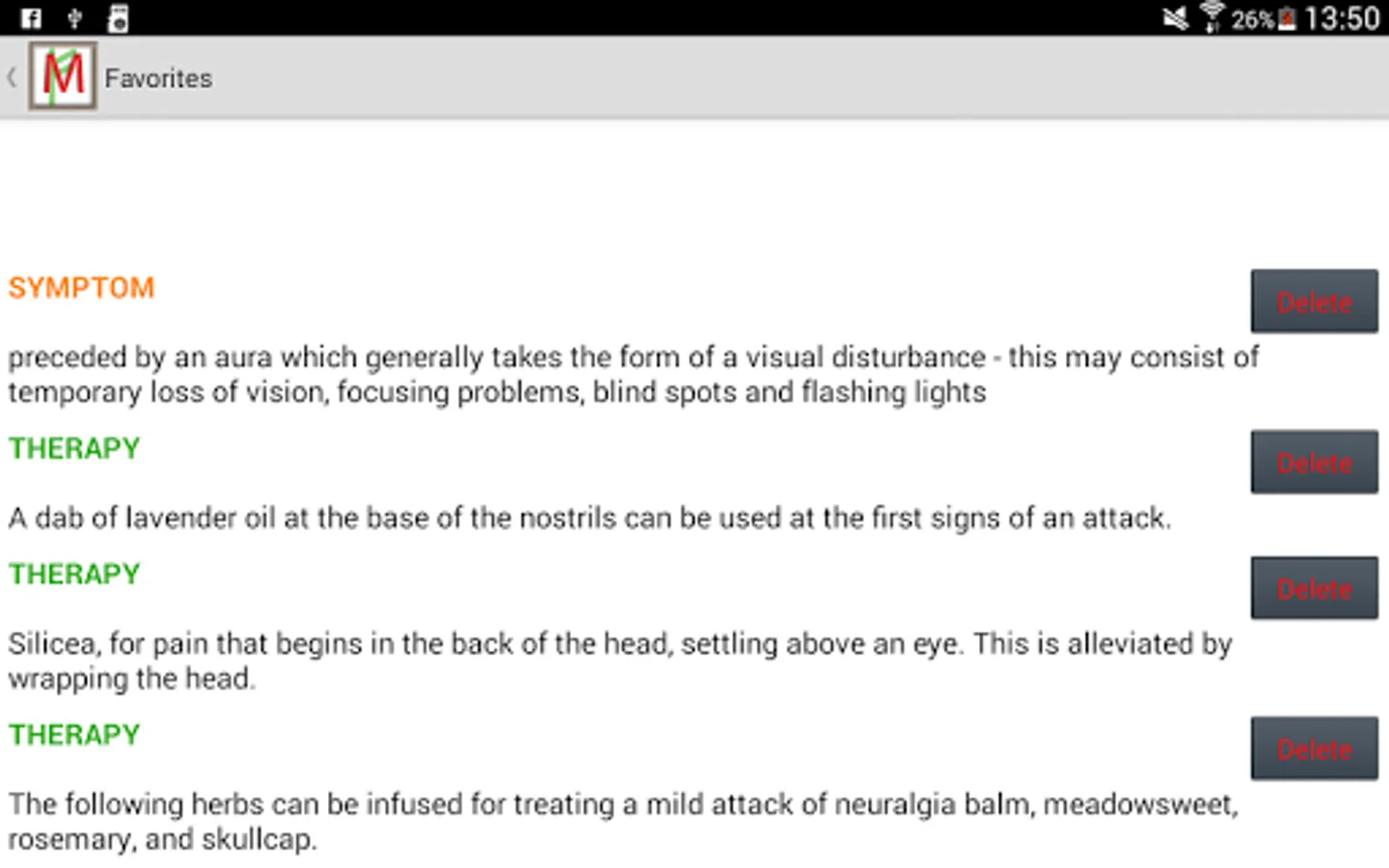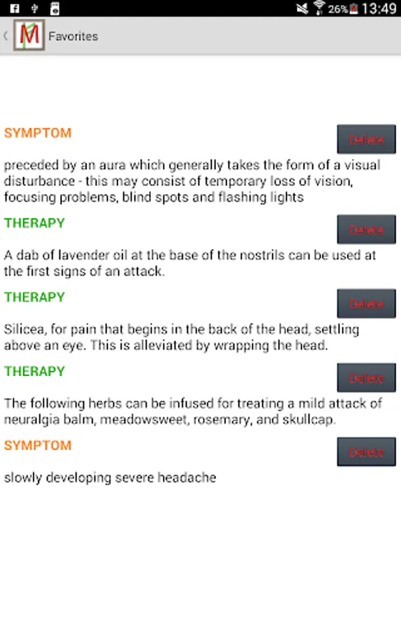 Finally, tap on Your Therapy. You will see a list of symptoms (in orange) mixed with a list of remedies (green) that you have selected. Taken together, the symptoms and the remedies form your therapy. Now all you have to do is obtain the remedies and start the process of eventual improvement of your health.