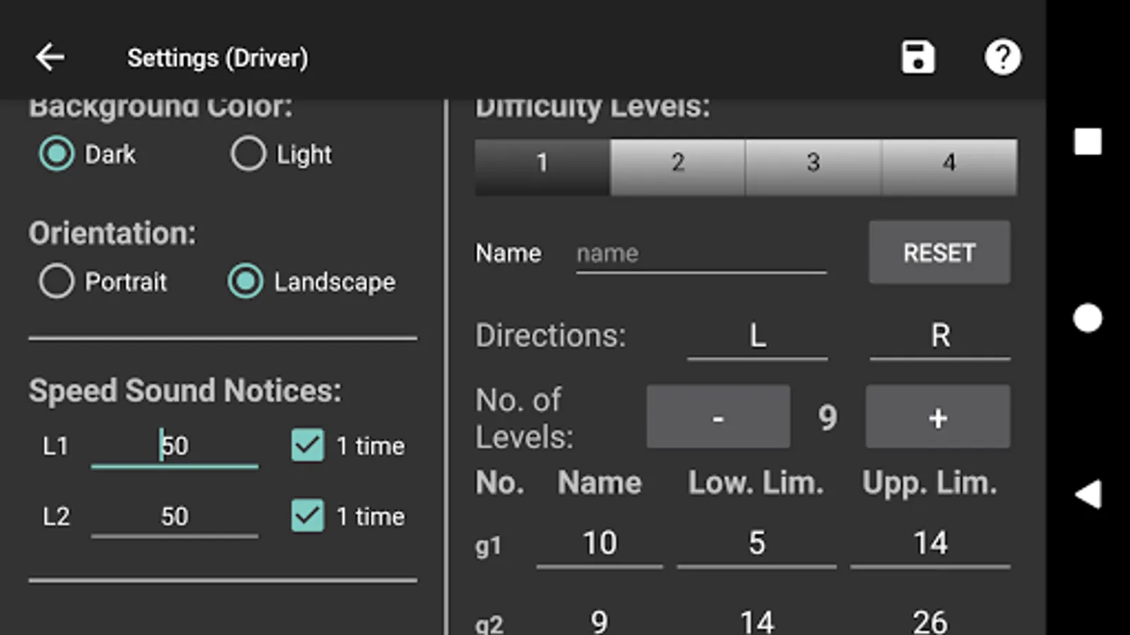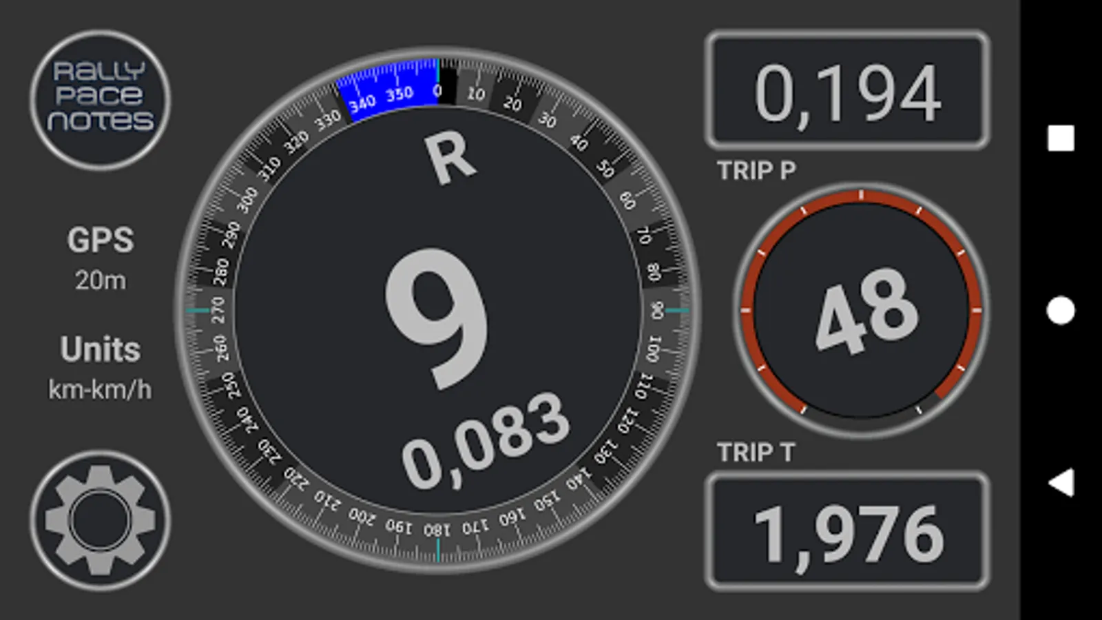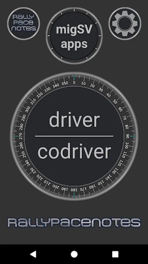 The "Driver" section is designed to help rally drivers in the difficult task of doing special stages pacenotes. The app allows teams to write down the intensity of each corner using the steering wheel angle rotation. The numbering of each corner, "8", "3+", "120" or any other information that each pilot uses in its pacenotes system, is fully configurable, as well as the strip of degrees in which it must show the Information.