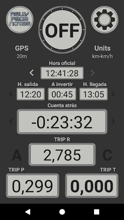 The "Codriver" section is divided into 3 screens. The first offers codrivers the tools necessary to facilitate the management of times and distances between time controls. It allows to calculate the time of entry in the following time control, it shows the real time, the time remaining until the next time control and 3 trips (regressive, partial and Total) that calculate the distances by means of GPS. It also shows the current speed of the vehicle (obtained by GPS), which will be of great help especially those cars that do not have a speedometer to not exceed the speed limits in the road sections.