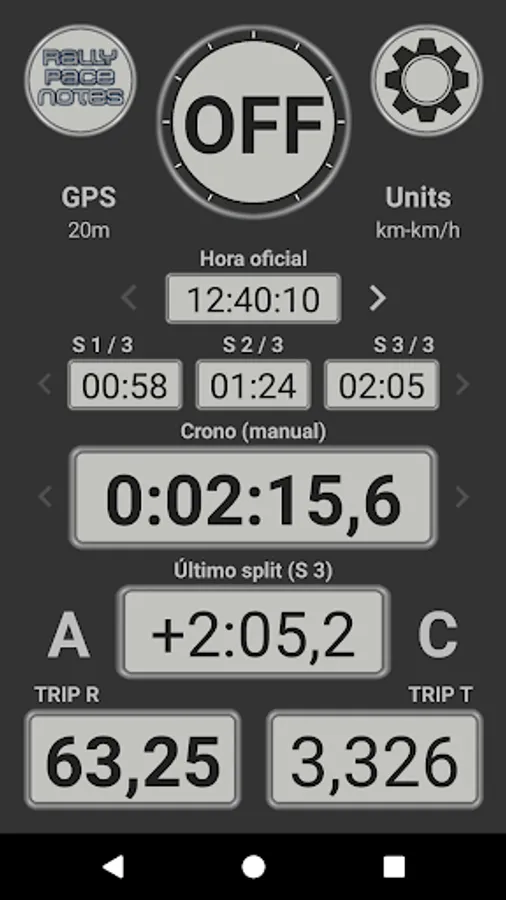 In addition to intensity, the application also helps us calculate the distances between corners using GPS signal. The driver has up to 3 different trips. One “partial”, another “total” and even a third specially designed to measure the corner’s lengths.