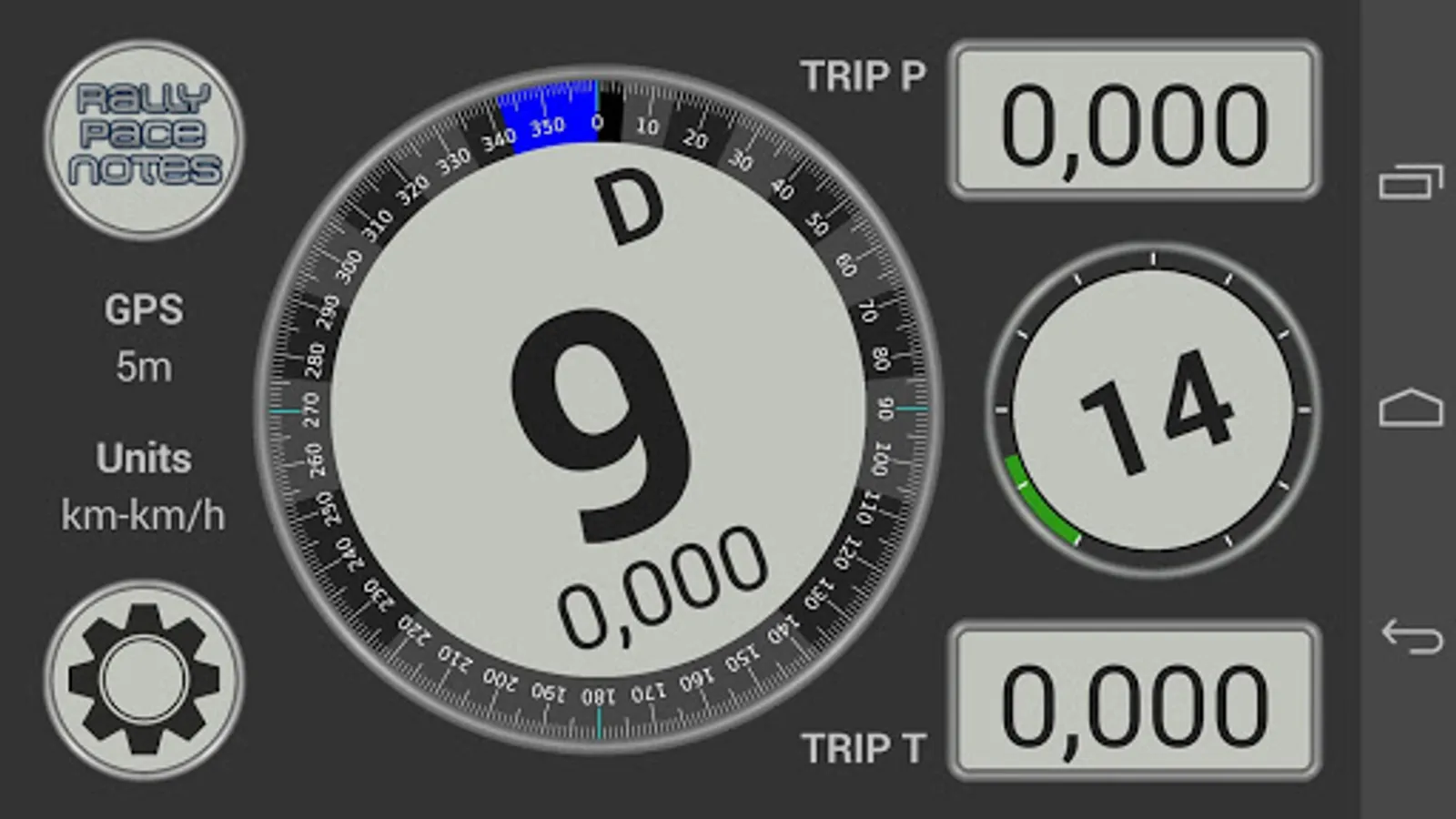 The "Driver" section is designed to help rally drivers in the difficult task of doing special stages pacenotes. The app allows teams to write down the intensity of each corner using the steering wheel angle rotation. The numbering of each corner, "8", "3+", "120" or any other information that each pilot uses in its pacenotes system, is fully configurable, as well as the strip of degrees in which it must show the Information.