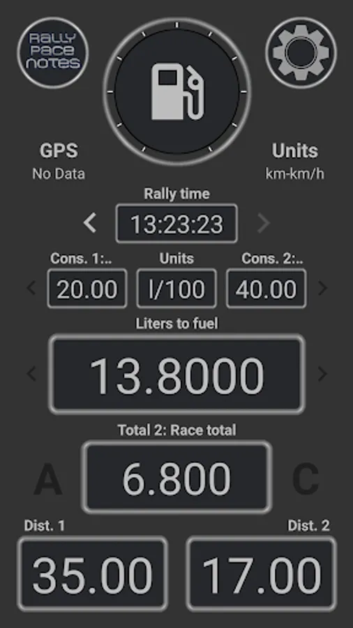 A third screen helps us to calculate a forecast of the fuel consumption until the next refuelling, distinguishing between kilometers and consumptions of road section and special stages.