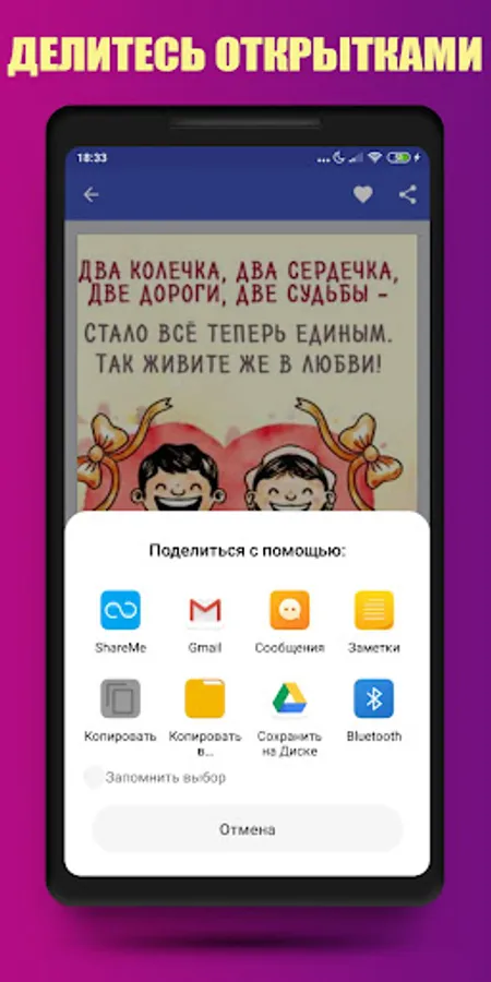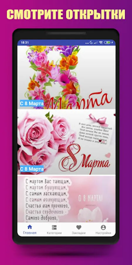 The application "Postcards for all occasions" contains a large collection of creative virtual cards, so here you can find exactly what you need at the moment.