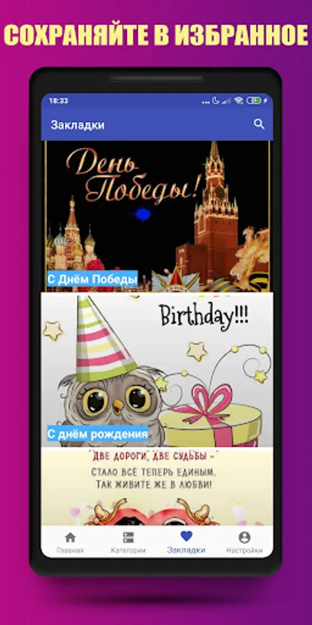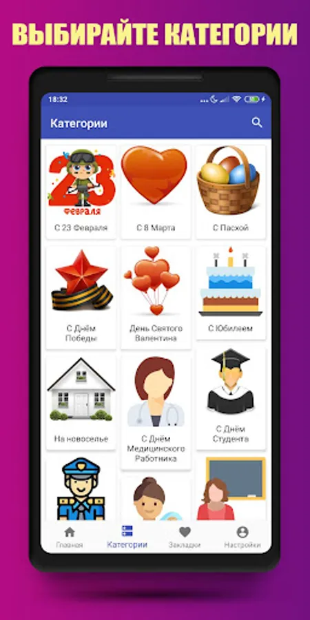 The “Postcards for all occasions” application is a variety of ideas for greetings and congratulations. All of them are divided by topic, depending on the addressee and the occasion, by collection and mood: