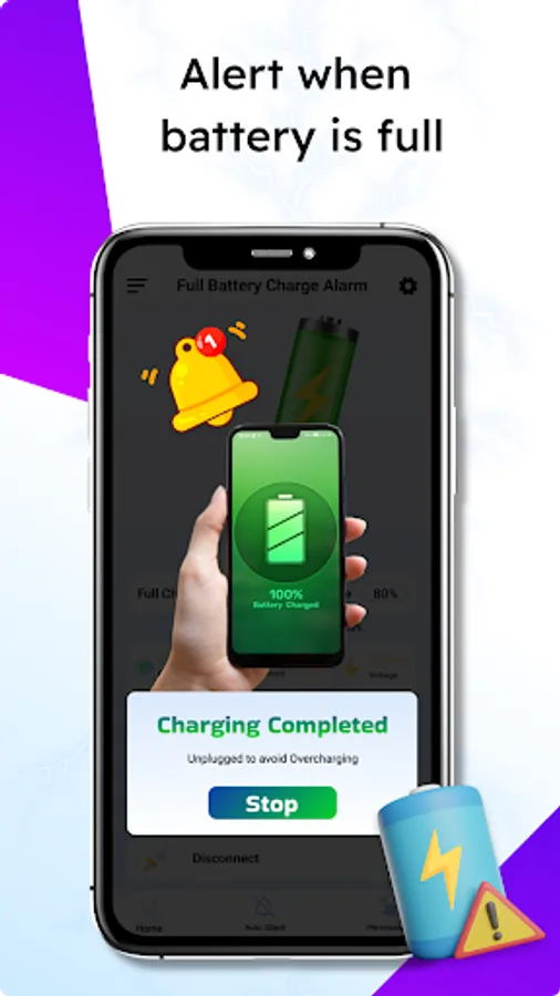 This Battery charge Alarm app informs you with high volume alarm tone when the battery is fully charged, and it is a very useful tool for your cell phone battery to protect it from over charging. You will be alerted when your device battery is 100% charged to protect it from damage and You will never forget the device on charger for a long period in today's busy schedule it is very hard to check the battery again and again.