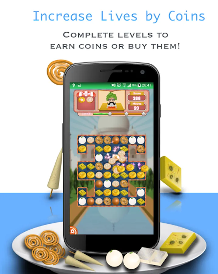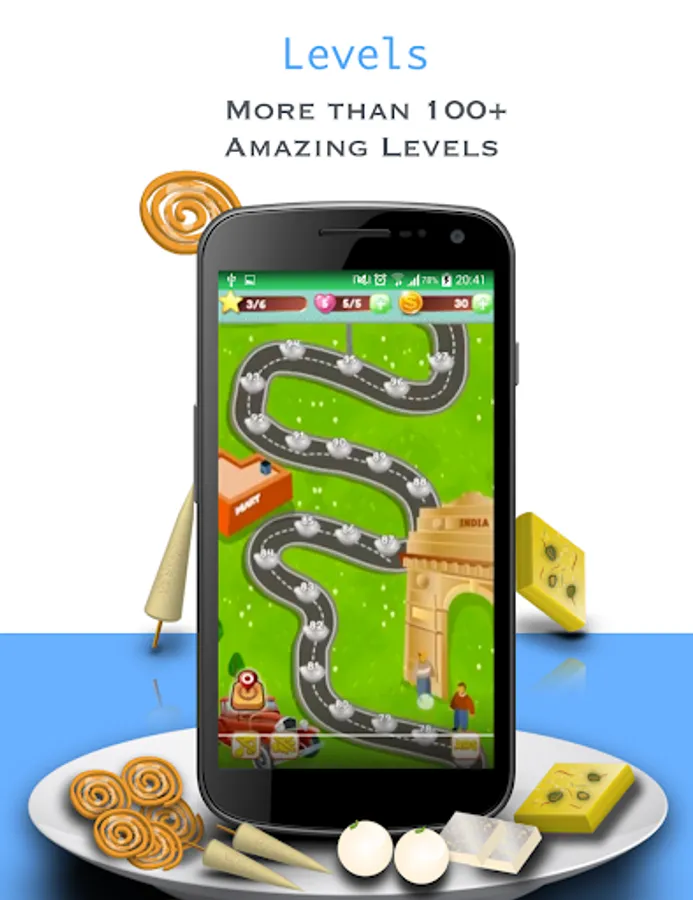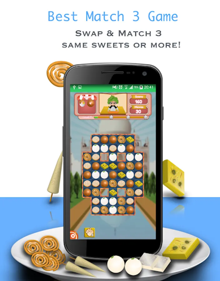 Meet our Friend sweet shop owner who needs help sorting his sweets. Help him match 3 or more sweets and travel through various lands of Country, visit the wonders of the worlds and match up the sweets and go further in your journey.