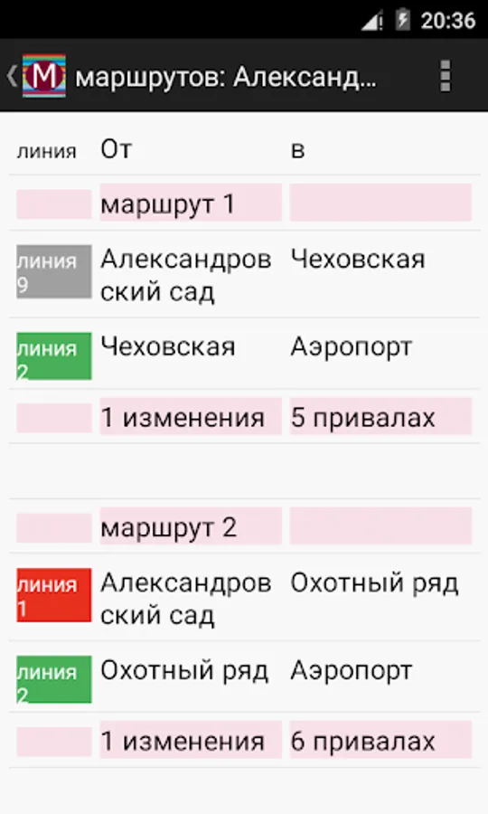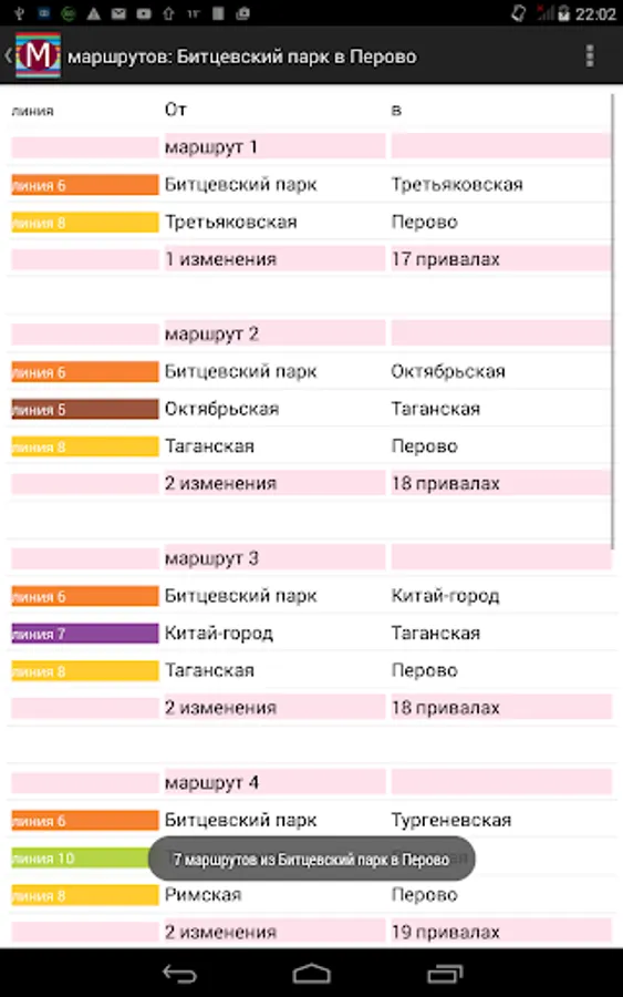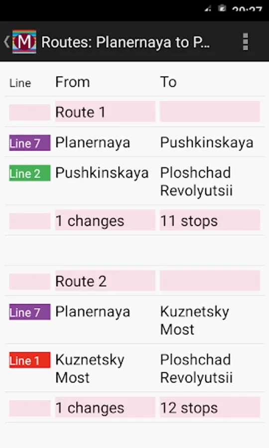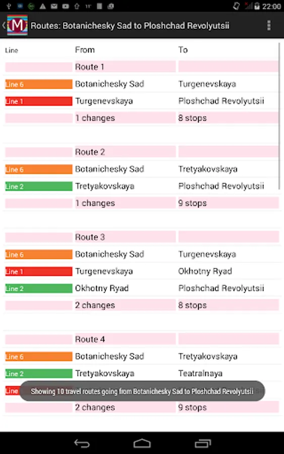 The search provides you with a list of alternative routes which can be used to travel from the source to destination station. It provides you with the number of line changes and station stops involved in each route.