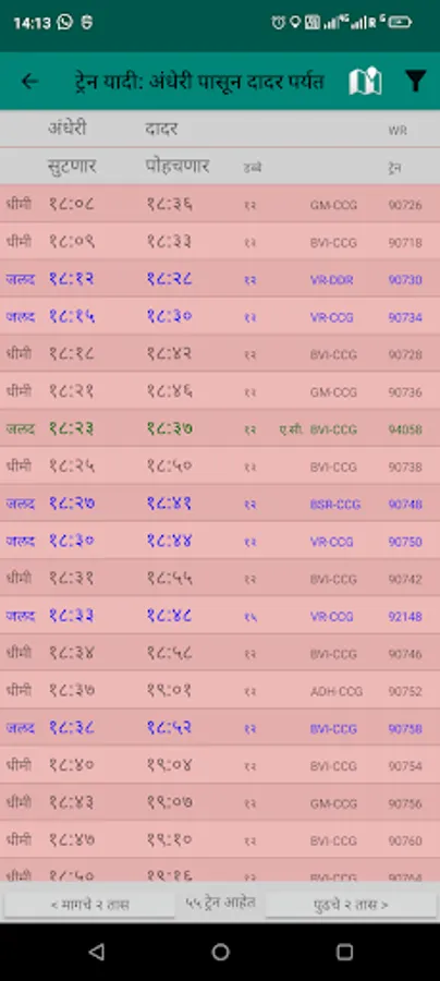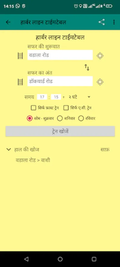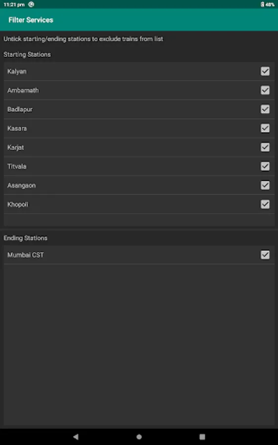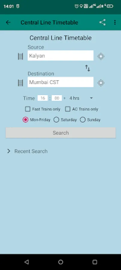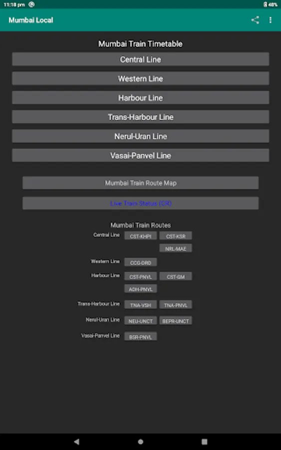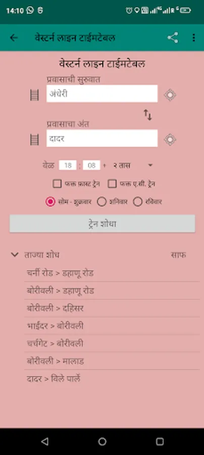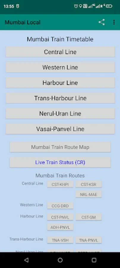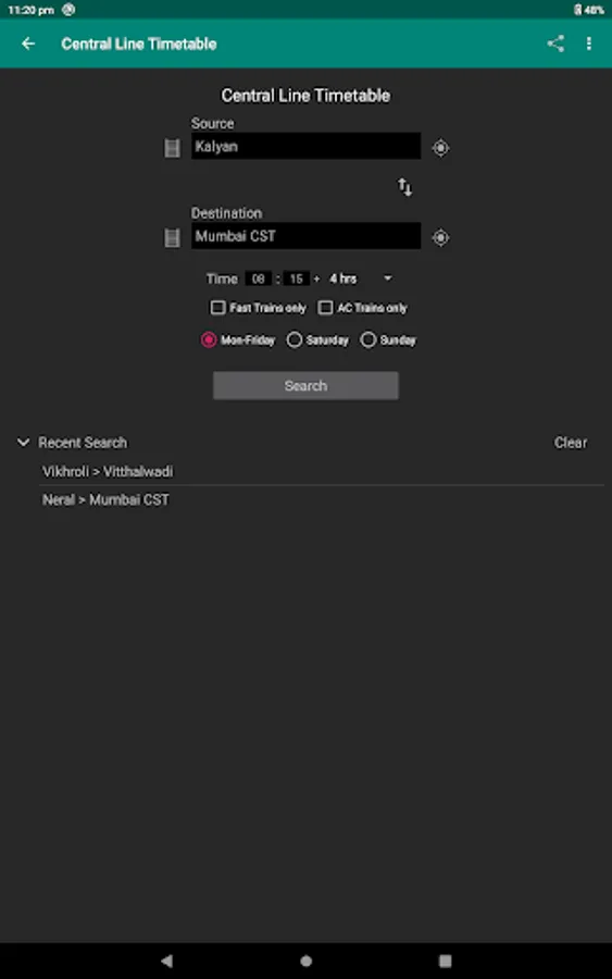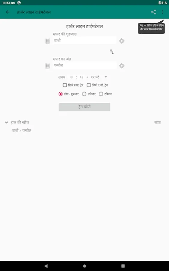 This app provides information about Mumbai suburban/local train services running between two train stations at or after a given time of day.