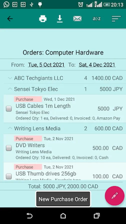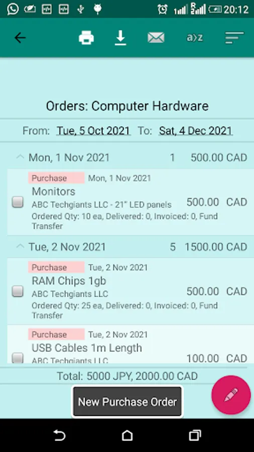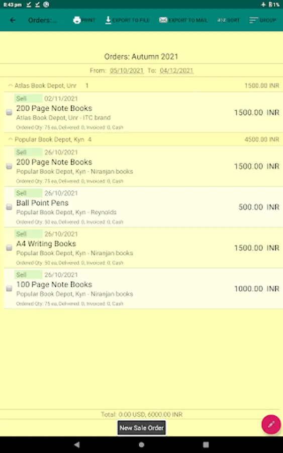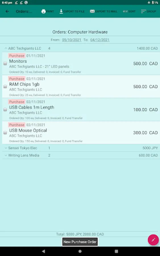 The orders can be grouped by date, partner, item, currency, etc parameters. You can also sort the orders by different methods.
