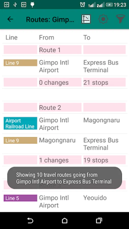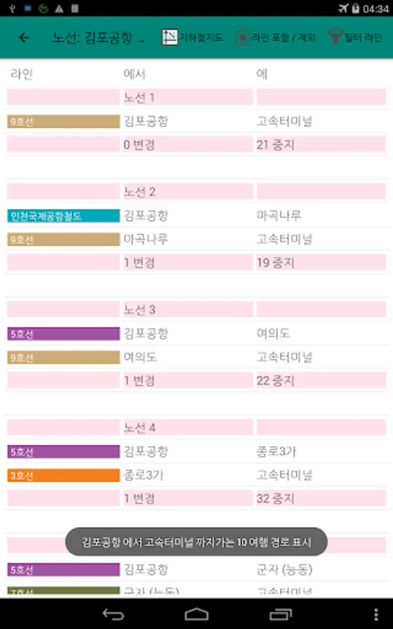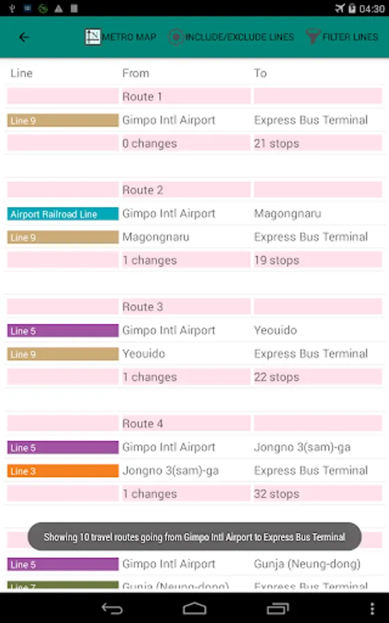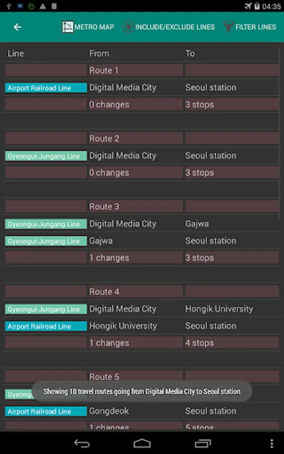 The search provides you with a list of alternative routes which can be used to travel from the source to destination station. It provides you with the number of line changes and station stops involved in each route.