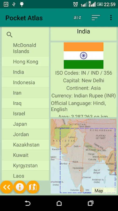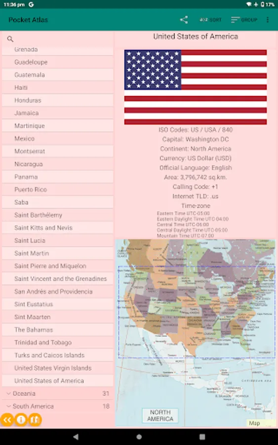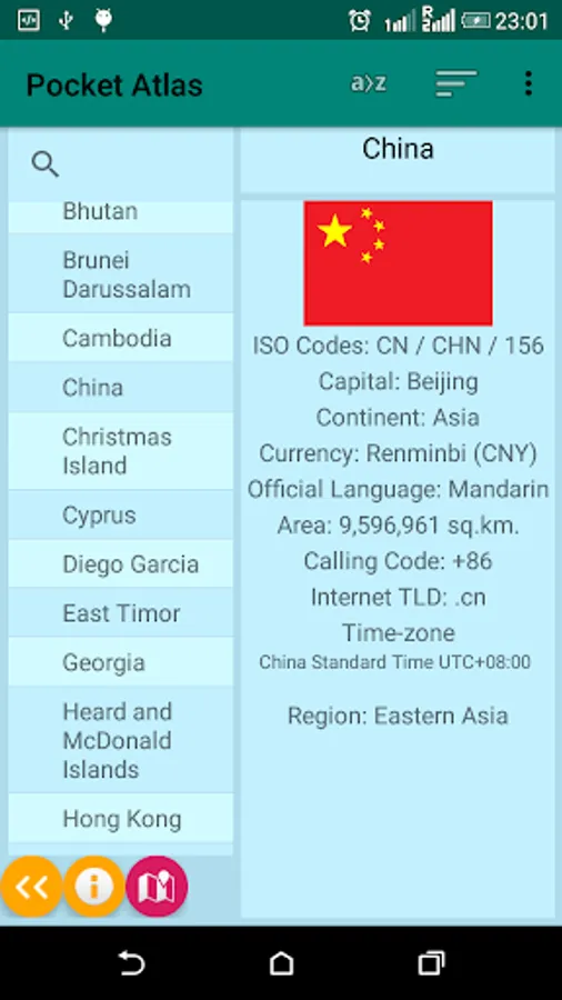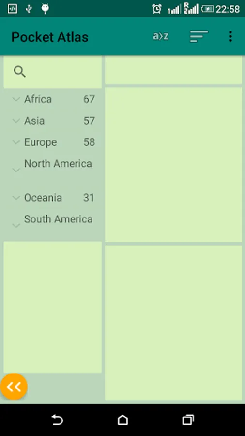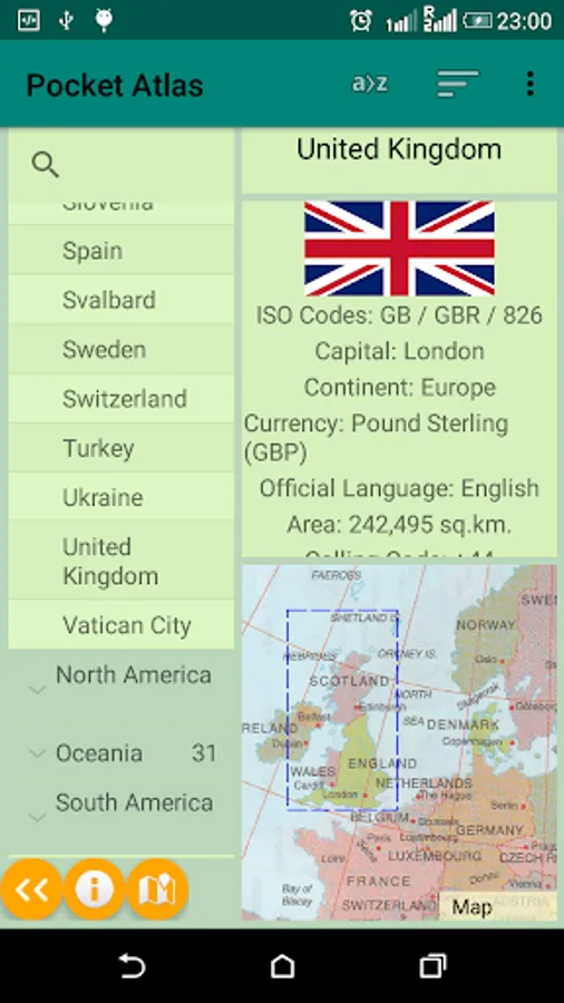 You can show/hide the views and swipe them left/right, if required zoom on the map. You can group the countries by continents, regions, time-zones, etc. You can sort the countries by their names, areas, etc.