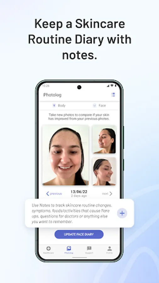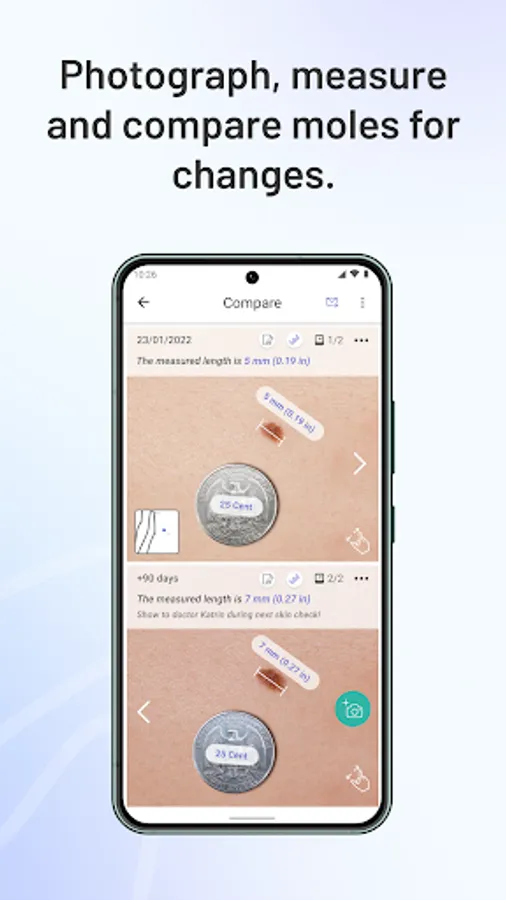 - Use the SIDE-BY-SIDE VIEW to compare your baseline and follow-up photos over time to easily spot changes in your skin and moles