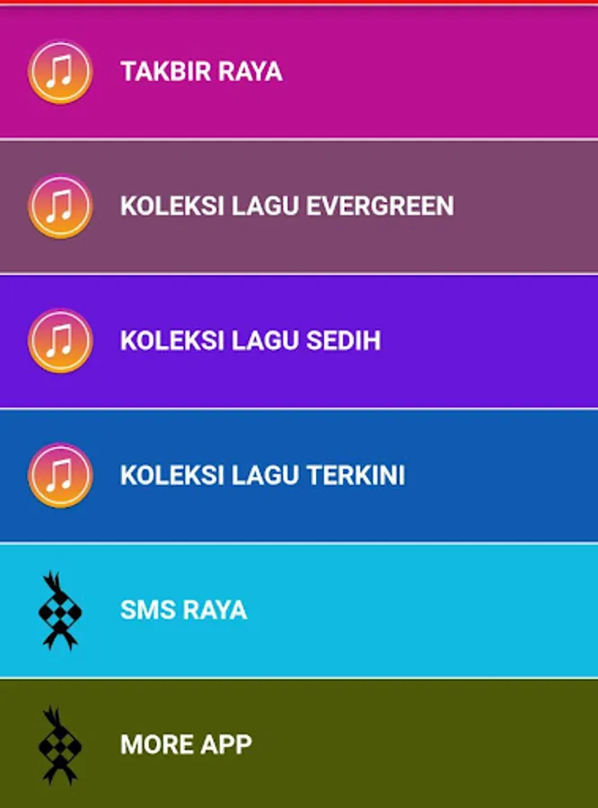Aplikasi mengandungi koleksi lagu-lagu raya yang terbaik dan popular pada hari raya