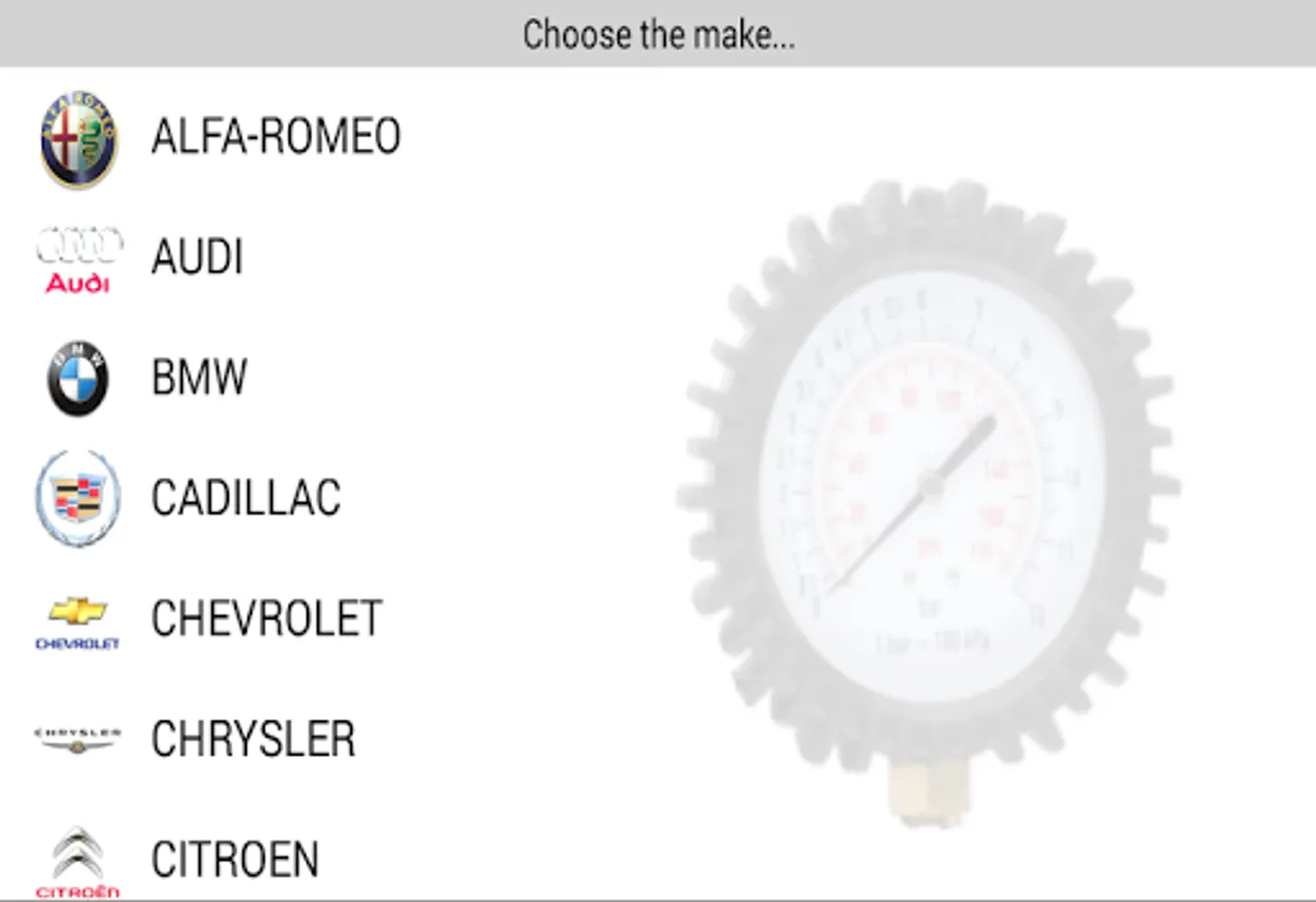 This app lists the tyre pressures recommended by the vehicle manufacturer
