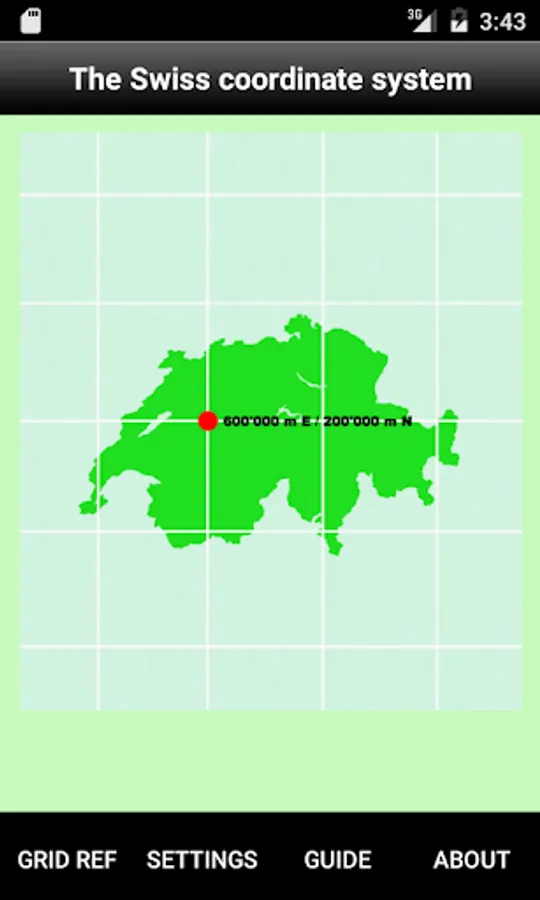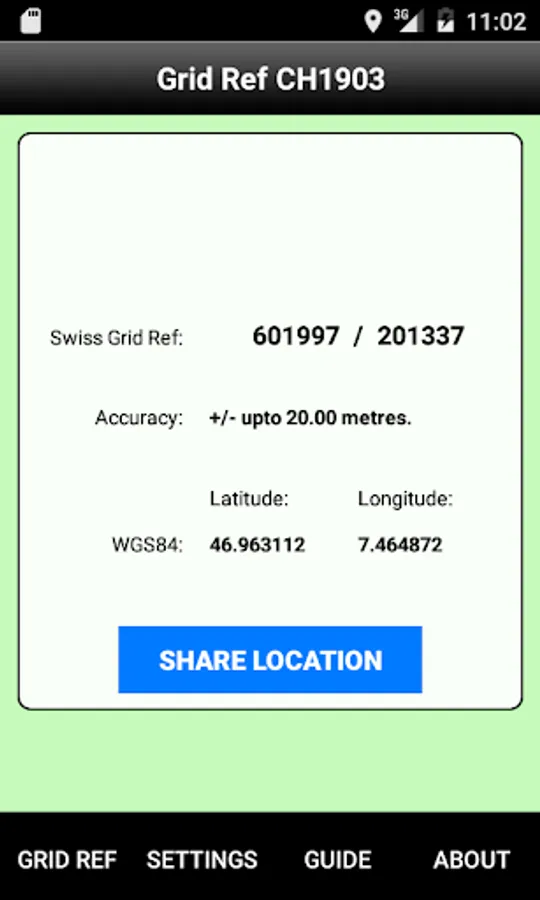 App Provides: Swiss Grid Ref, and WGS84 Latitude and Longitude values.