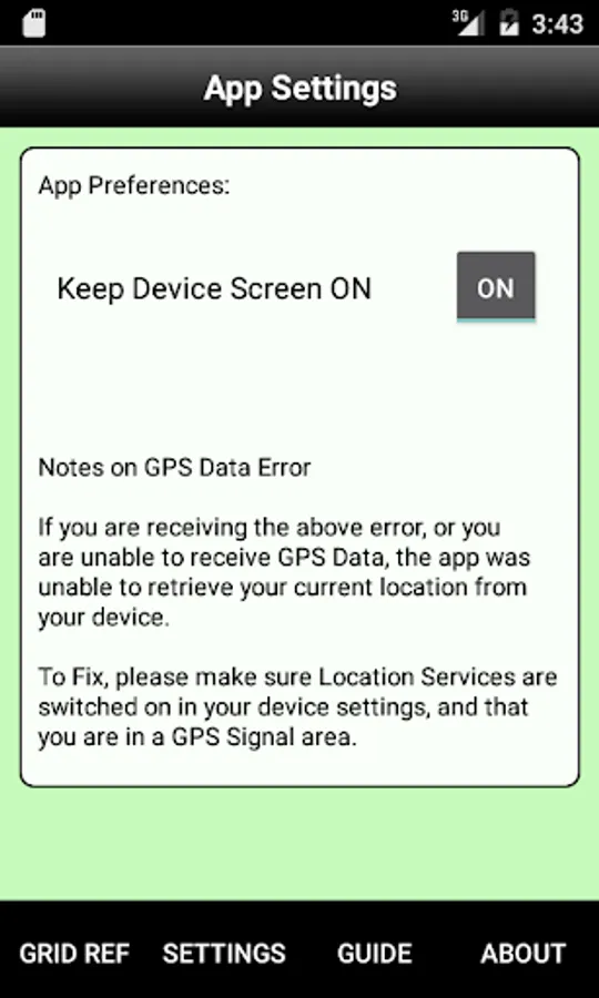 The screen can, optionally, be set to stay on, for continued on-screen display of Grid Reference information.