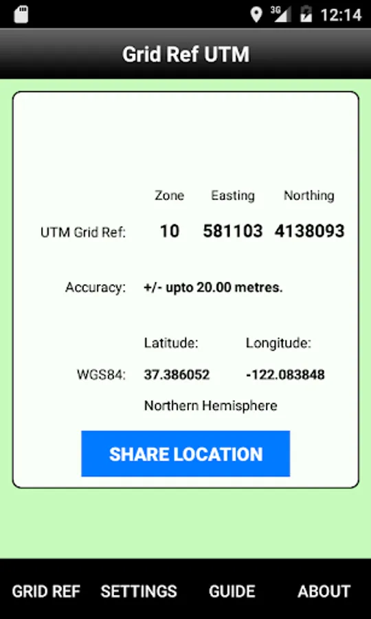 App Provides: UTM Grid Ref, Hemisphere, and WGS84 Latitude and Longitude values.