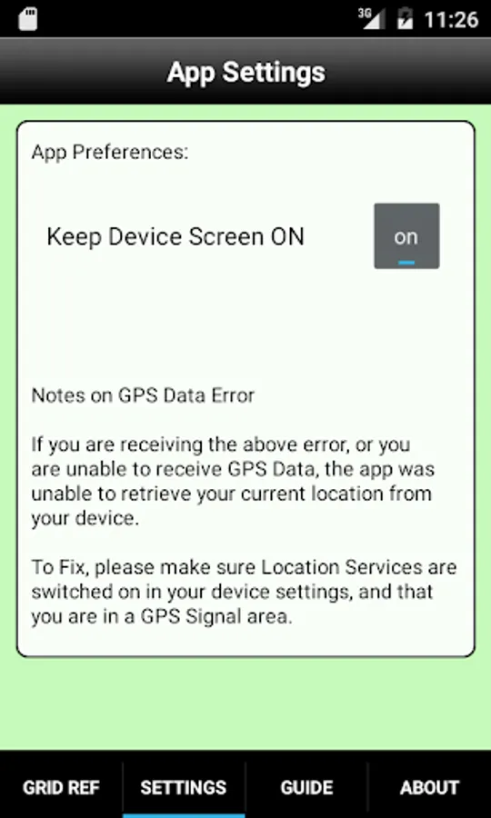 The screen can, optionally, be set to stay on, for continued on-screen display of UTM Grid Reference information.