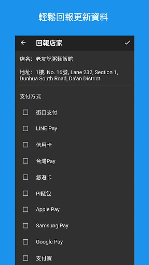The payment map allows you to quickly check the store's payment method, so that you will no longer be afraid of having no cash at the checkout. And gather the reports of the users to keep the database up to date and the most accurate information.