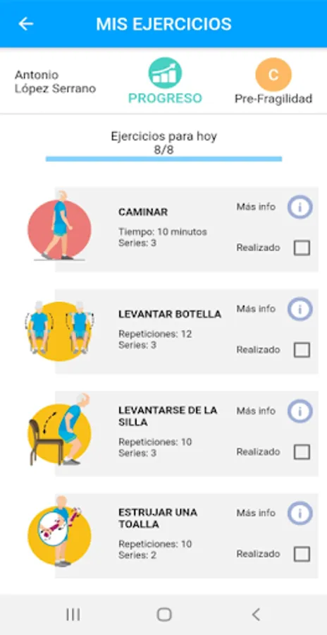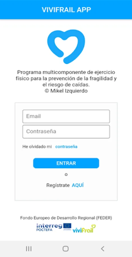 This App allows seniors to be classified, based on the conclusions made within the framework of the Erasmus + project called Vivifrail (www.vivifrail.com), based on their risk of loss of functional capacity, dependence and risk of falls. Once the elder has been categorized, the App proposes the realization of an individualized multi-component physical training program for the prevention of frailty and falls in people over 70 years old (© Mikel Izquierdo. Multicomponent program of physical exercise for the prevention of fragility and the risk of falls, 2017)