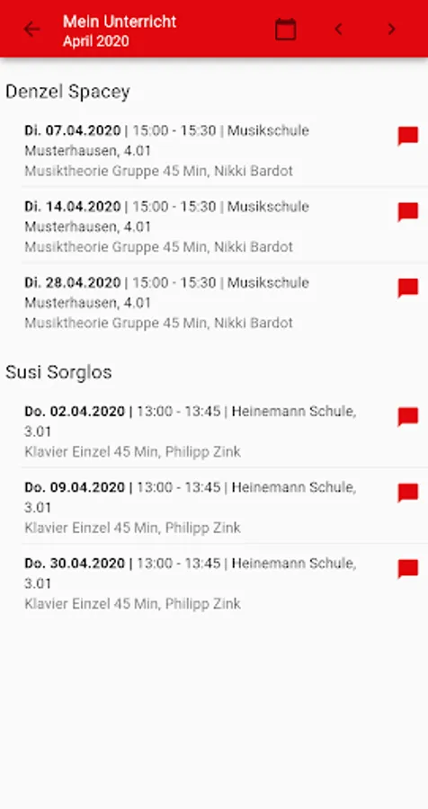 All functions for exchanging messages between teachers, parents, students and the music school do not require any contact information. Messages are transmitted via an app-internal ID. No email addresses or cell phone numbers are required for chat and message exchange!