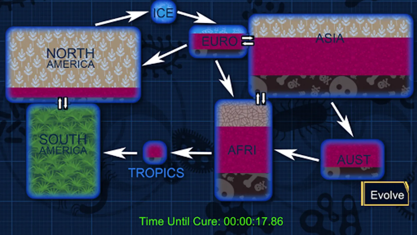 The clock ticks down quickly giving you a short run (around 60-90 seconds) each game to infect all humans and wipe them out. Nothing pauses humanity's efforts to cure you, so work quickly in the evolution and region detail screens to win.