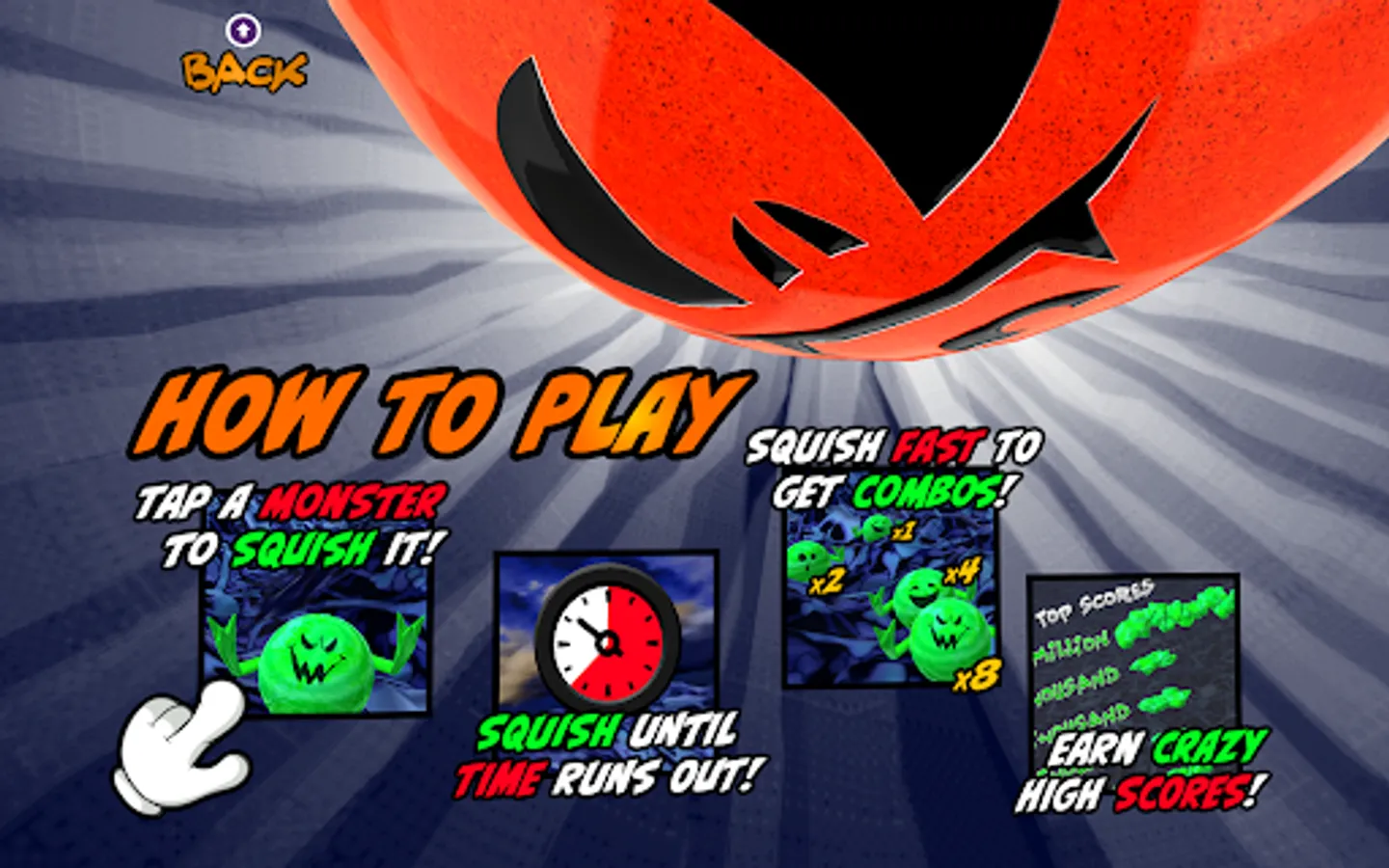 An assortment of Halloween monsters have gotten loose! Visit unique environments and squish them to curb the outbreak! Tap a monster to squish in a cartoon burst of color and goo. Squish as many as possible in the shortest amount of time to score bonuses. But watch out, because the monsters will fight back!