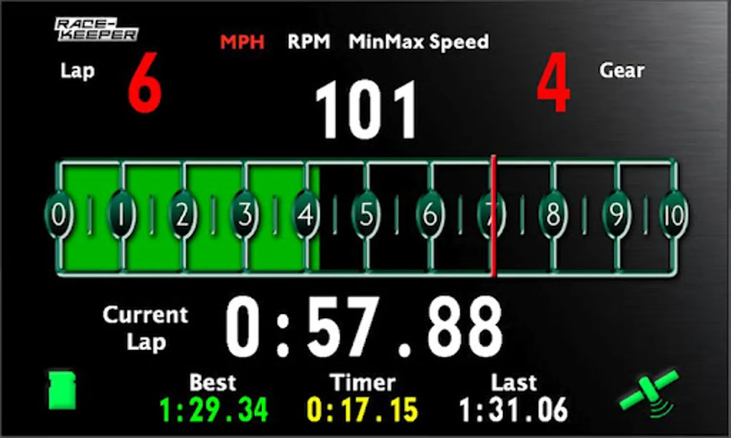 Race-Keeper’s predictive mode displays predicted lap times, and clearly displays current performance with a unique “bow tie” display, which shows faster (green) or slower (red) graphical relative data as well as the time difference in seconds, and tenths.
