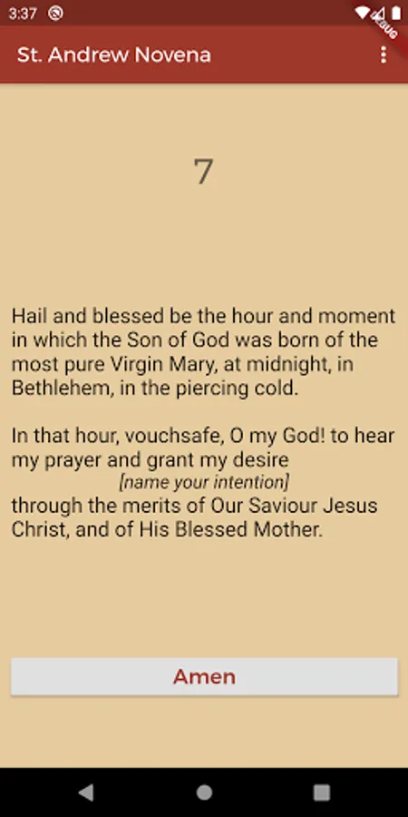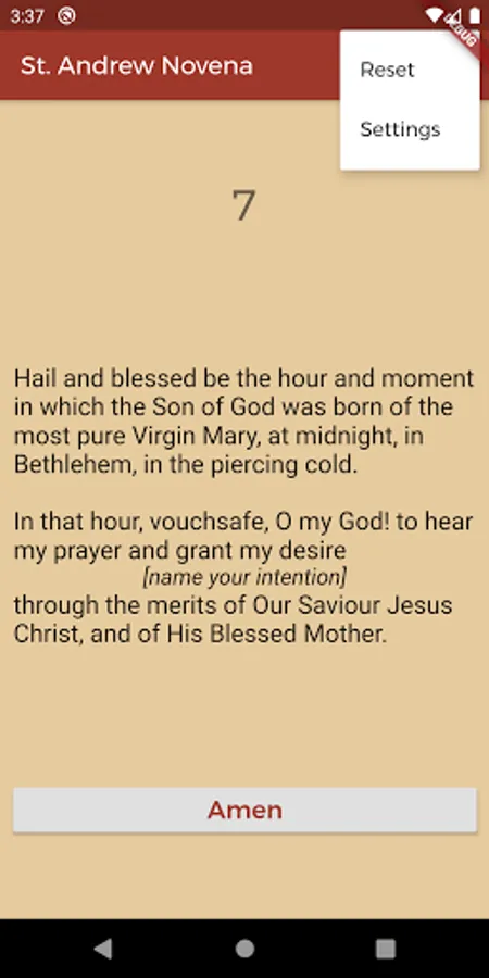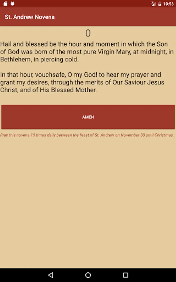 This traditional Catholic prayer is typically recited 15 times daily starting on the Feast of St. Andrew and finishing at Christmas. This app will help you track how many times you've recited this prayer each day.