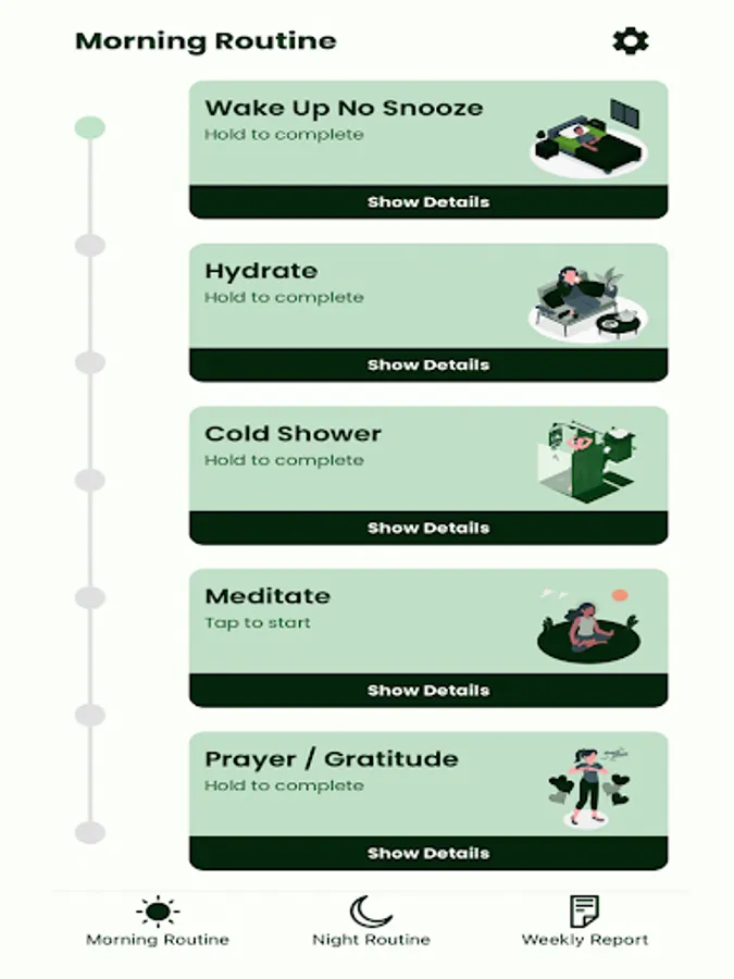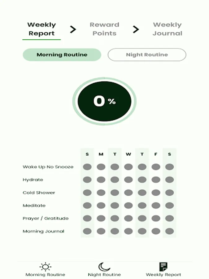 HabitApp uses the formation of the habit loop to help the user form each habit. The user can track their progress by checking the Weekly Report where the scores for the completion of the Morning and Night Routines can be seen. This is an indication of how the user has been able to put themselves in position to influence the outcomes that they desire. HabitApp’s aim is to help the user get into the habit of building habits by focusing on what is within their control and making the most out of the opportunities of each day no matter the setback.