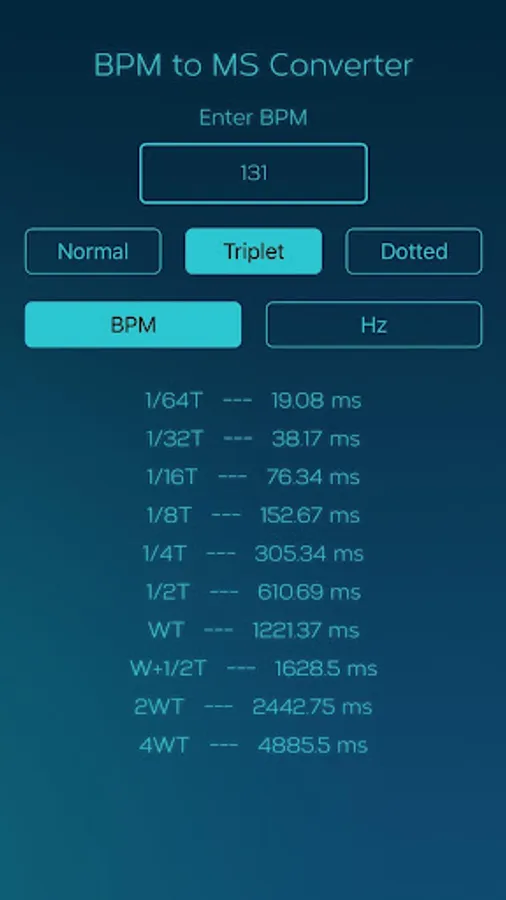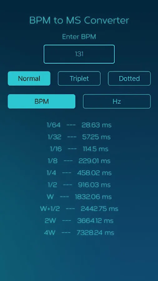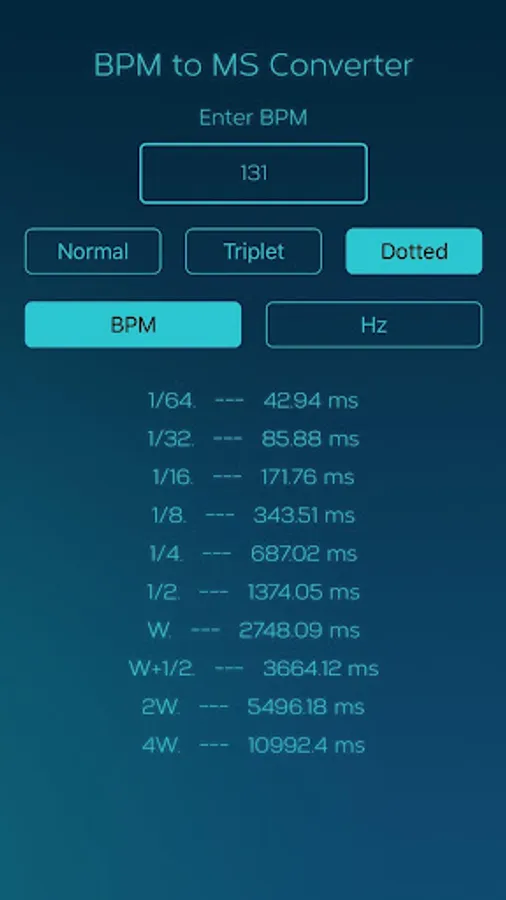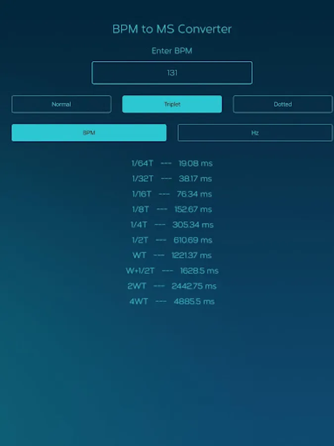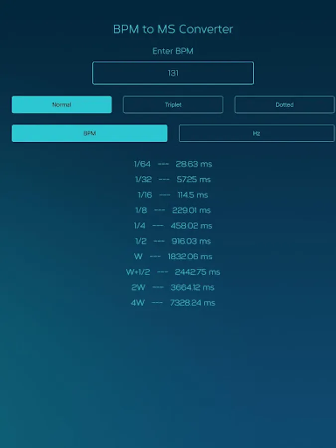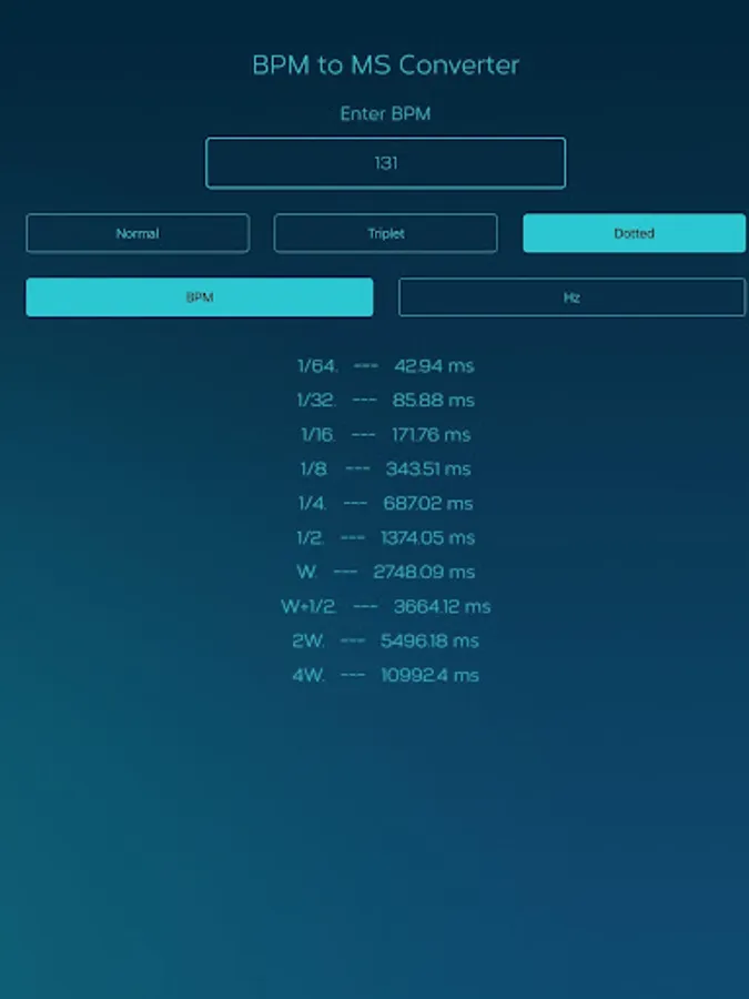 BPM to MS converter and BPM to Hz LFO Calculator. Convert beat divisions to miliseconds & Hz for delays, reverbs, LFOs, and effects