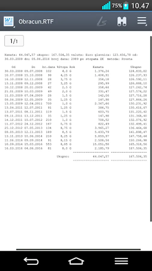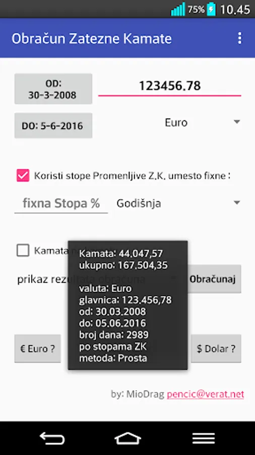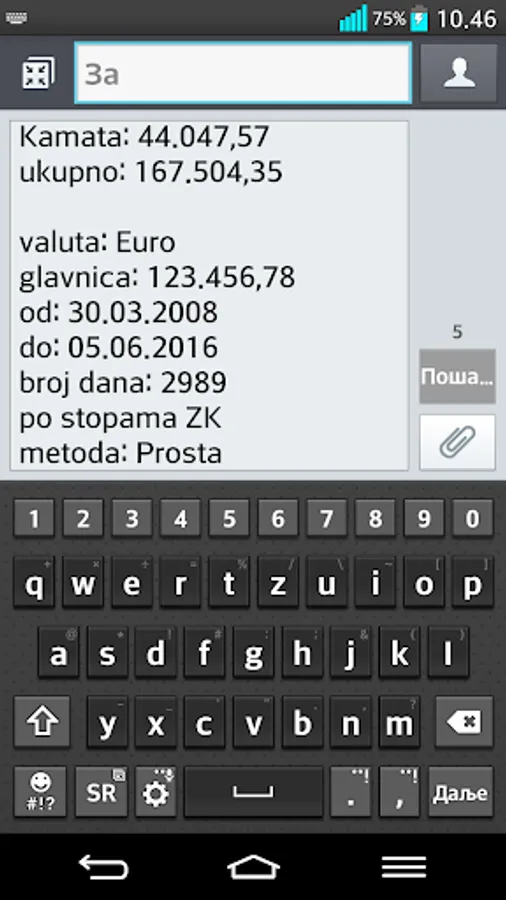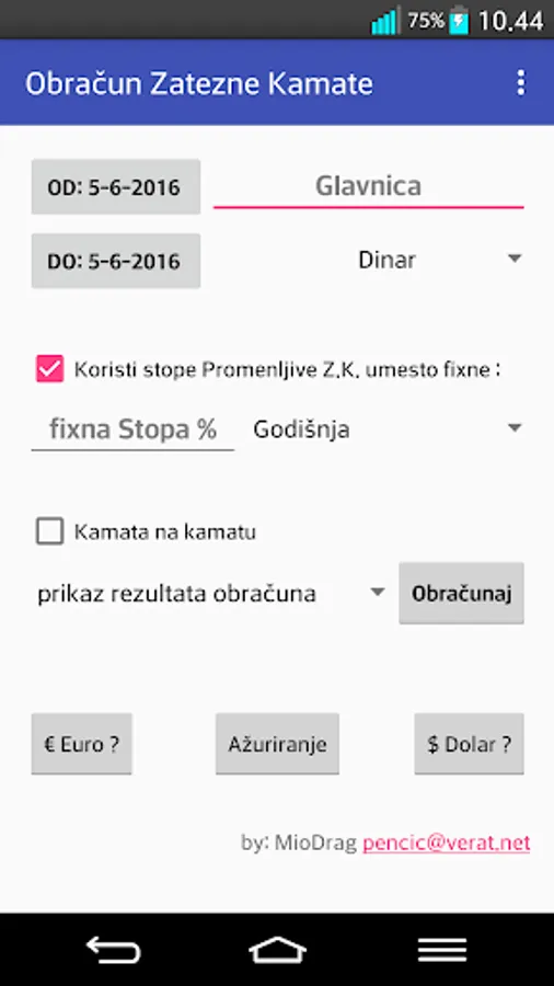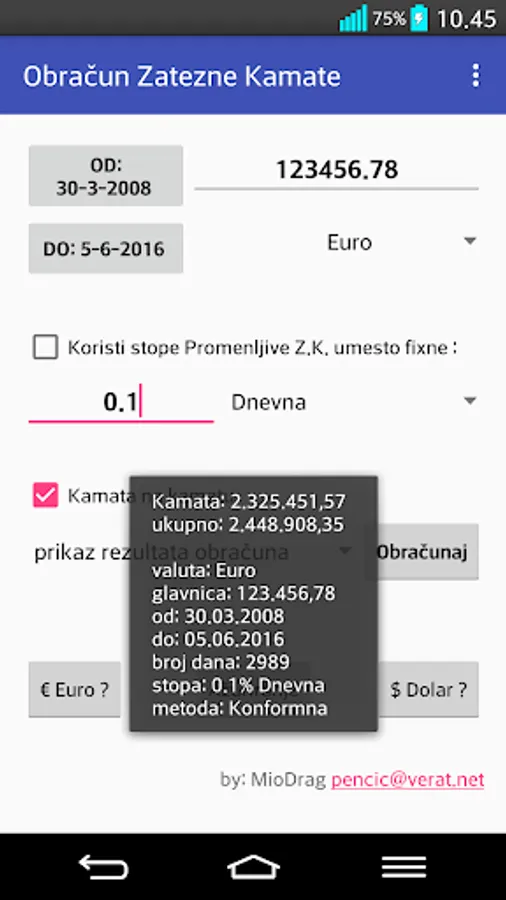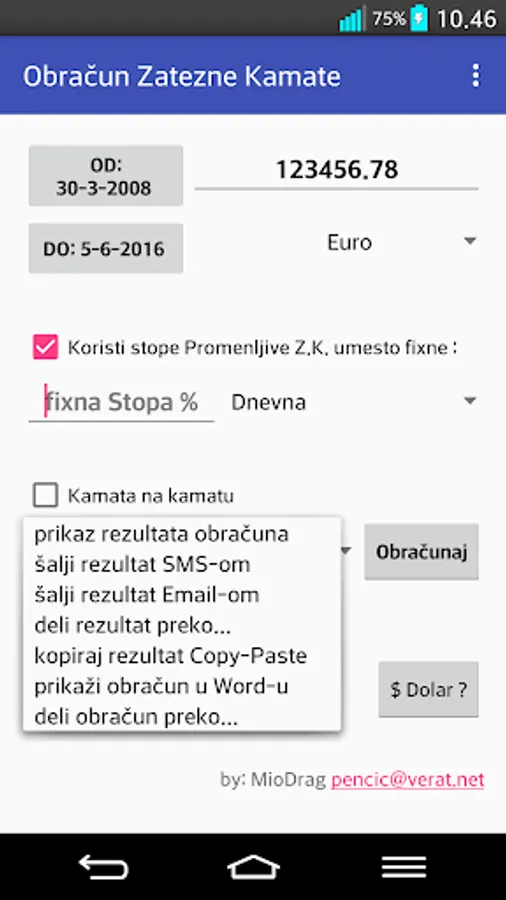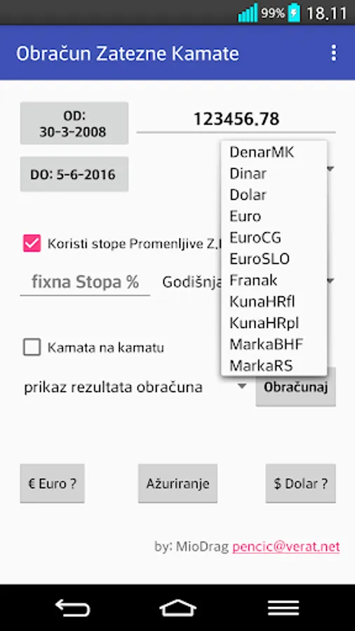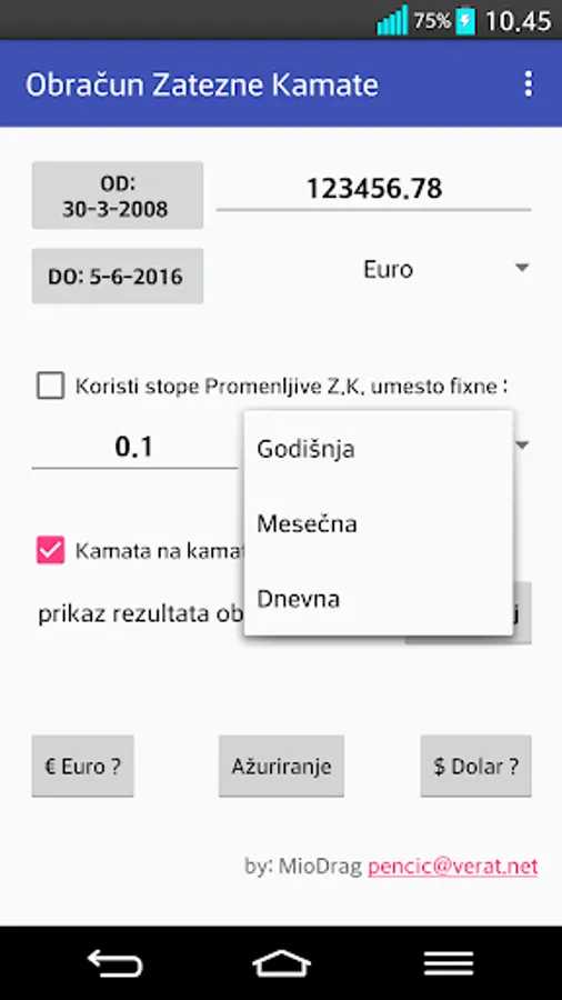 Easy and fast charging penalty interest from android smartphones: The application already has entered the penalty interest rate for the Serbian dinar currency, the euro, the dollar and the franc, for a little more than 20 years. Also incorporated are the rates for the euro in Montenegro, Serbian Republic rate of the convertible mark, the rates of the Federation of Bosnia and Herzegovina convertible mark, and the rate of Croatian, Slovenian and Macedonian, which is enough for most cases in practice. In addition, it is possible to calculate the interest and fixnoj interest rate, if this option is selected before the calculation. Besides the simple method, it is possible to calculate the interest and conform method, which requires only choose the appropriate option. If you select the SMS / Email, a result of calculation will be automatically placed in the SMS / Email message could be forwarded, or, for example. Details can be obtained by calculating the word document. From the menu can be used to get an overview of interest rates. In order to obtain the most precise calculation is necessary to regularly update the application, because in this way the application imports the latest published interest rates, as well as some new features in future versions of the application. When calculating, applications account interest on the actual number of days in a given time period, without approximations ie any month that has 30 days, or 365 days each year.