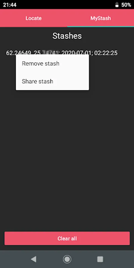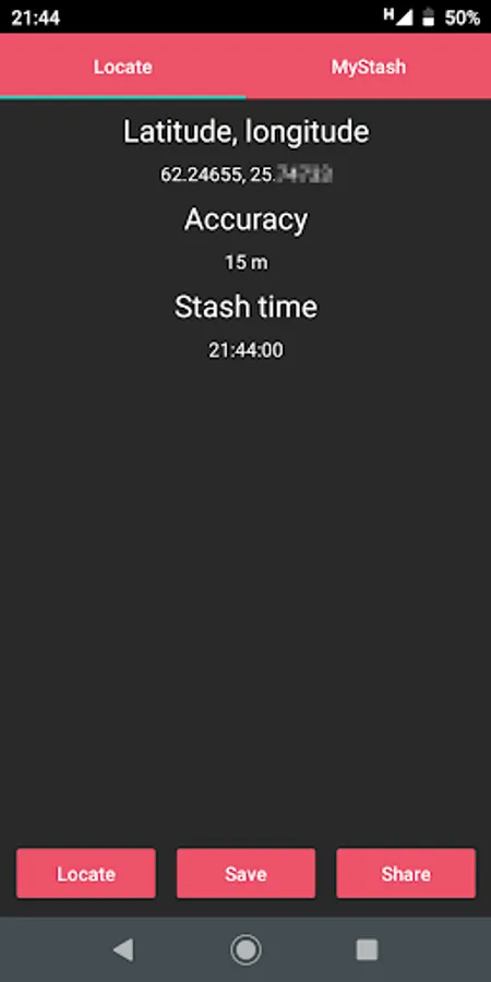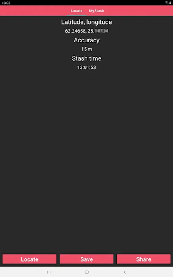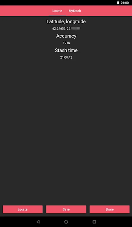 MyStash is your everyday GPS location app! Use this app to get coordinates for your position. The app shows your latitude and longitude. In addition, the app shows an estimate for the precision of the coordinates. You can save the coordinates in the app's memory. Furthermore, coordinates can easily be shared in various social media.