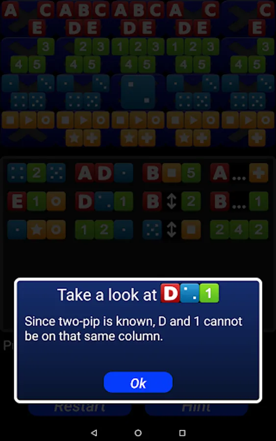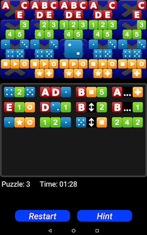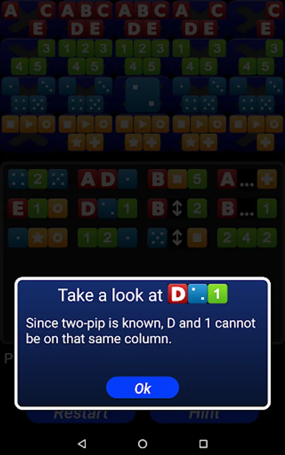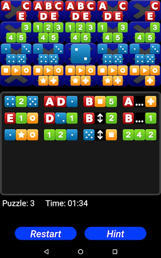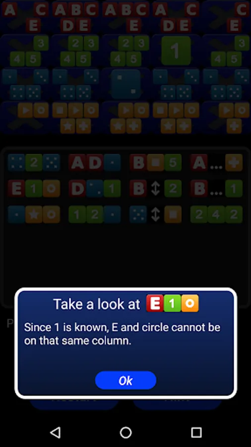 There are four different types of clues: "In between", "Left of", "Same column" and "Next to". "In between" clue tells that the middle tile has to be located in between the other two. It however does not tell the order of the other two tiles or how far they are from the middle one. "Left of" clue tells that the left tile has to be located left of the right tile. It however does not tell how far apart they are. "Same column" clue tells that the two tiles have to be on the same column. "Next to" clue tells that the two tiles are adjacent to each other. It however does not tell the order of the two tiles.