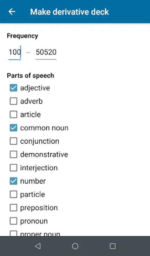 If you have purchased the complete deck for a language, you can filter the cards to make a deck of your own choosing. The cards can be filtered based on frequency, part of speech, and location in the Bible. If you just have the free starter decks, you can also filter the starter deck and derive new decks from it.