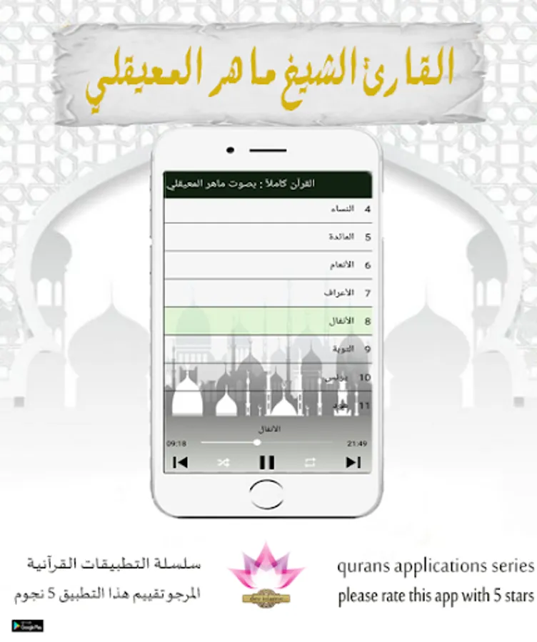 • Our users will not have to pay money to purchase the application, and you will not need a large space on your device to install `` the entire Qur’an: with the voice of Maher Al-Muqeili '', and after installing the application with ease from the store you will be able to listen to `` the whole Quran: with the voice of Maher Al-Muqeili '' Easily. As for the aesthetic in form, the interface of the application of the Noble Qur’an “The Qur’an in full: with a voice of Maher Al-Muaqili” is very simple. You will not have any difficulty from the beginning of downloading the program from the store until the download of the complete Qur’an: Maher Al-Muaqli’s voice.