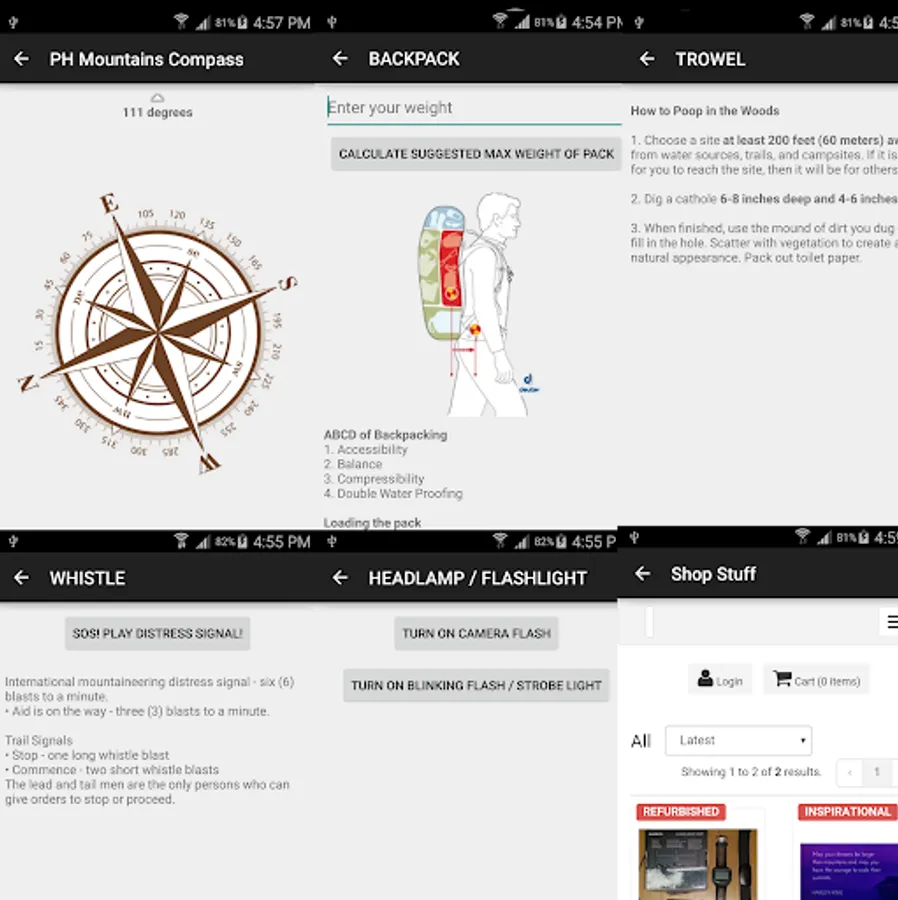 • Additional widgets such as compass, SOS whistle, flashlight, strobe light, and max pack weight calculator!